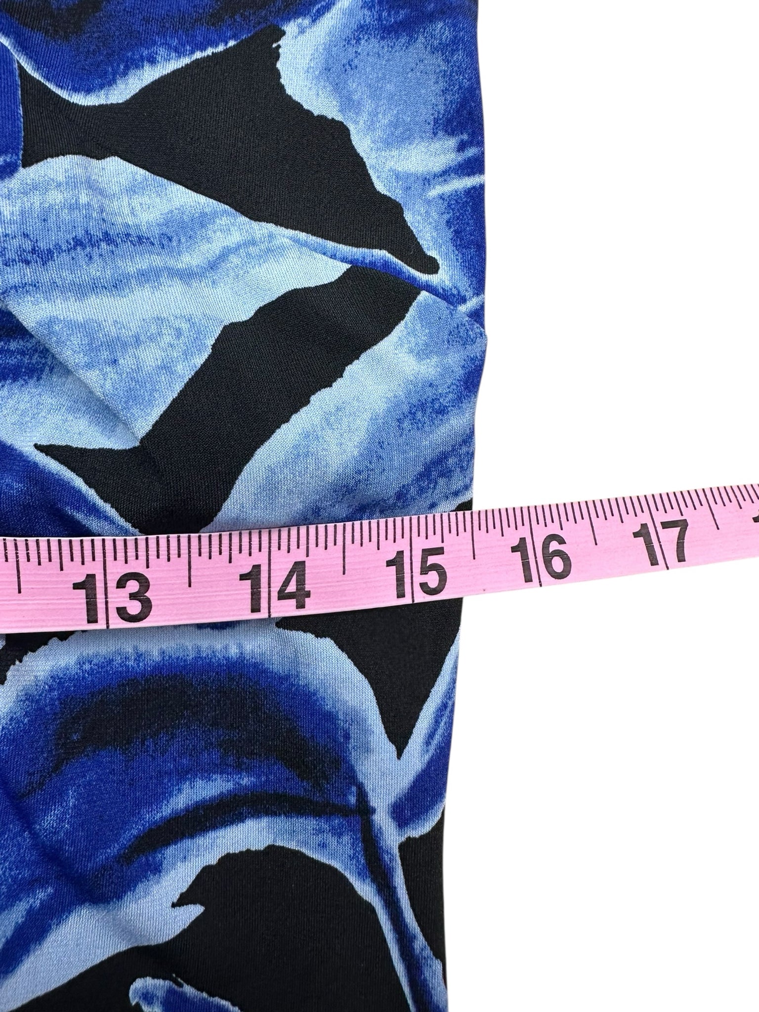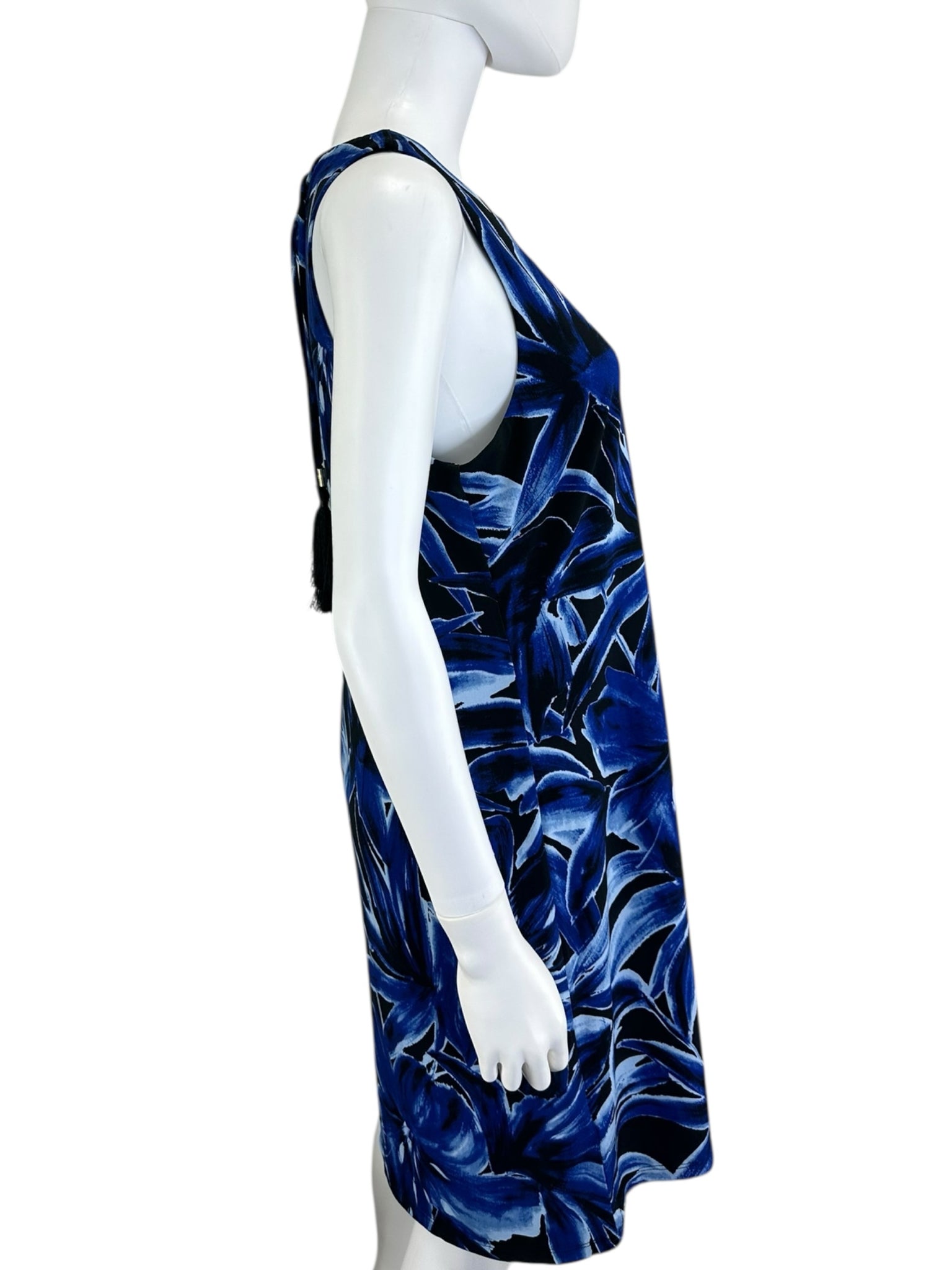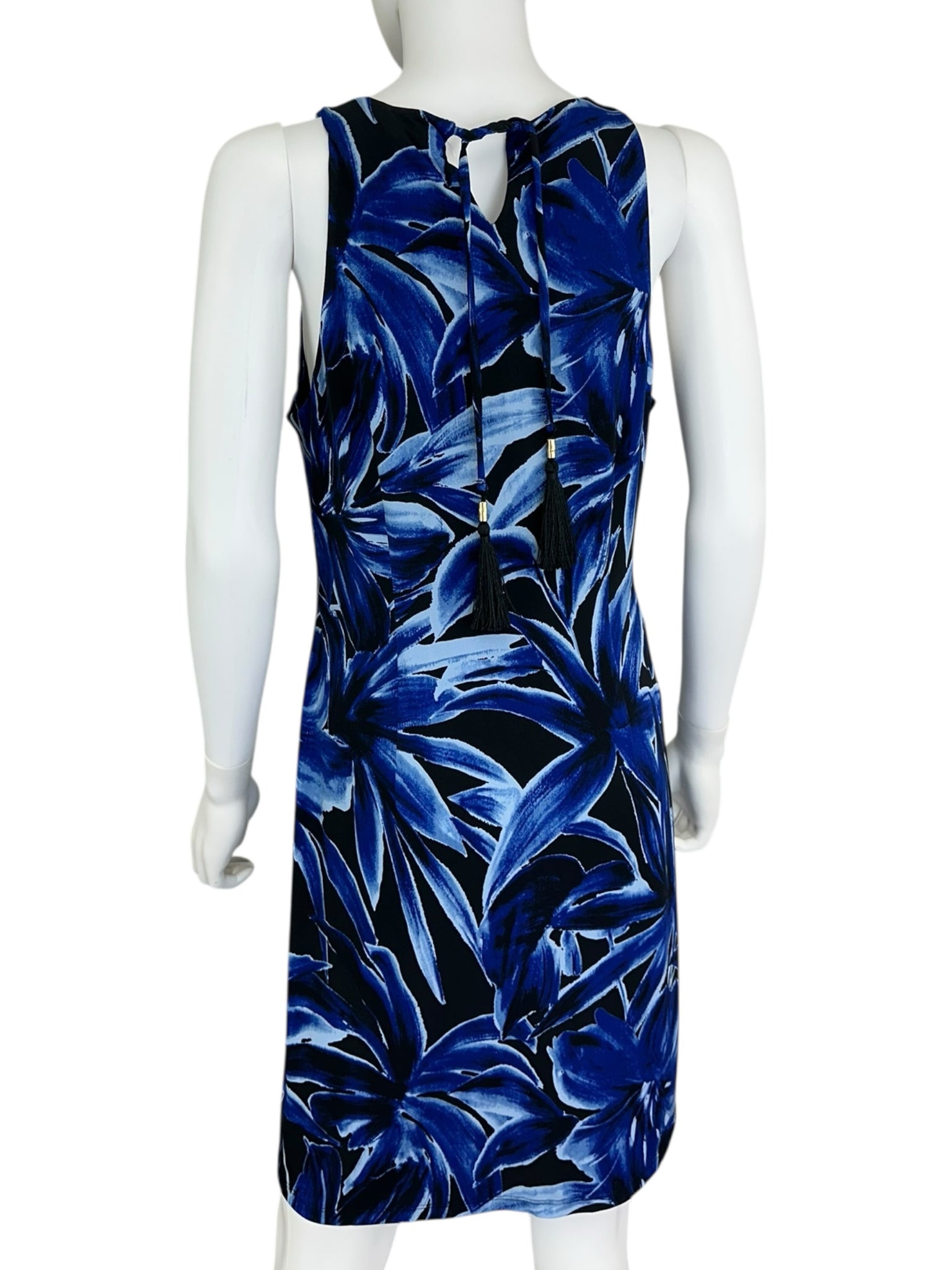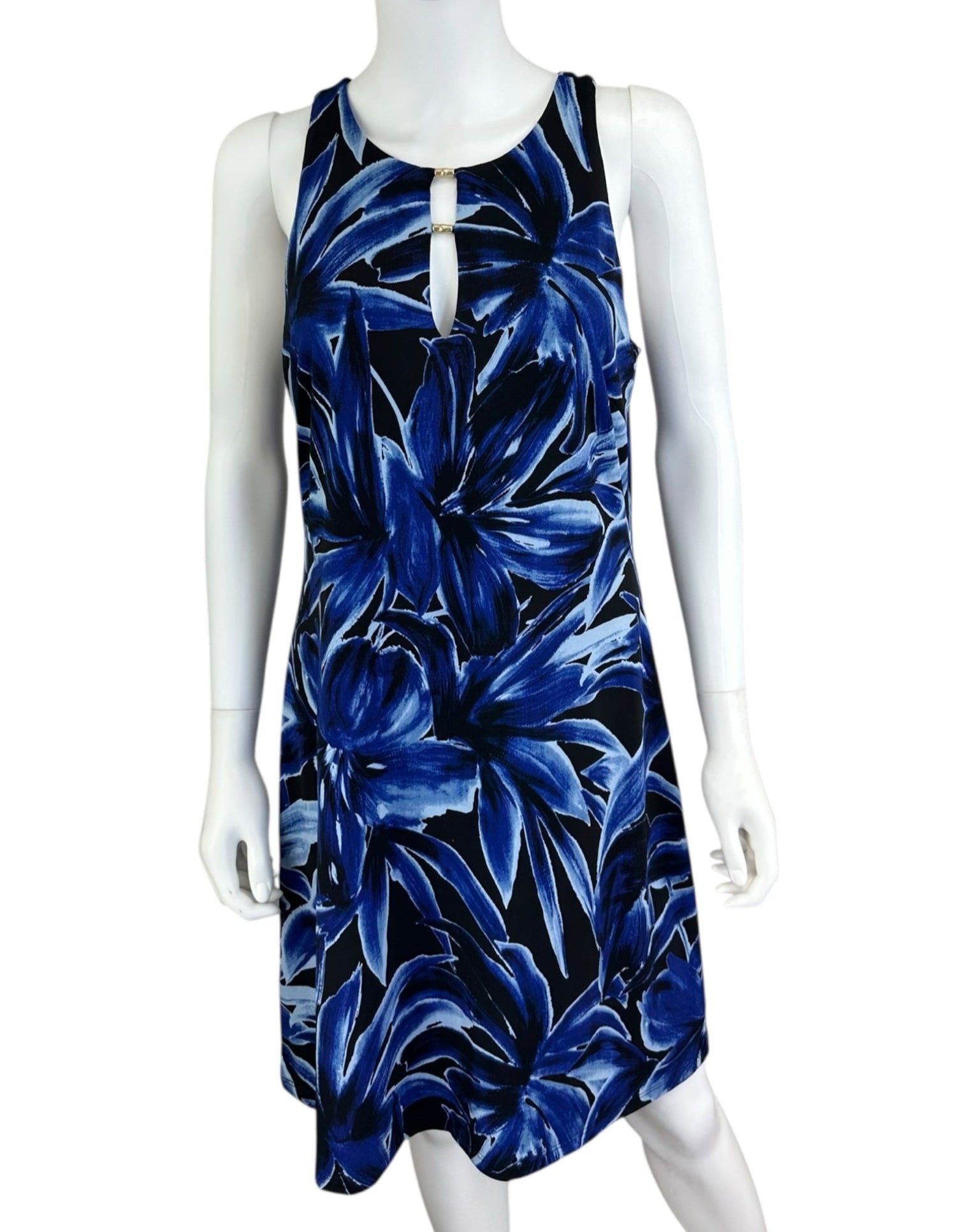 New with tags! Blue knee length navy & blue floral print sleeveless dress with a caged front neckline with gold bamboo hardware. Dress is made from a super comfy stretch knit Carmela fabric which is wrinkle resistant and travels well.