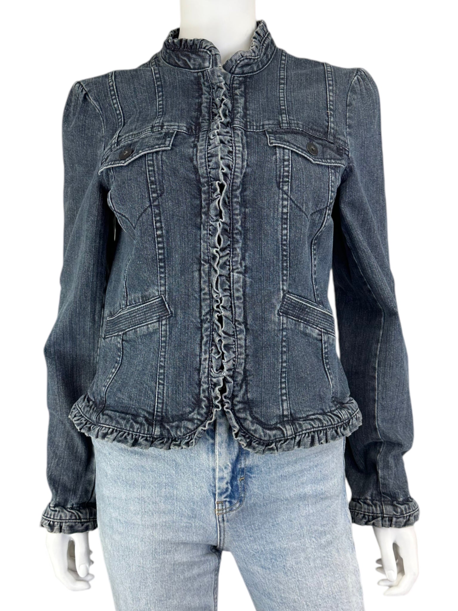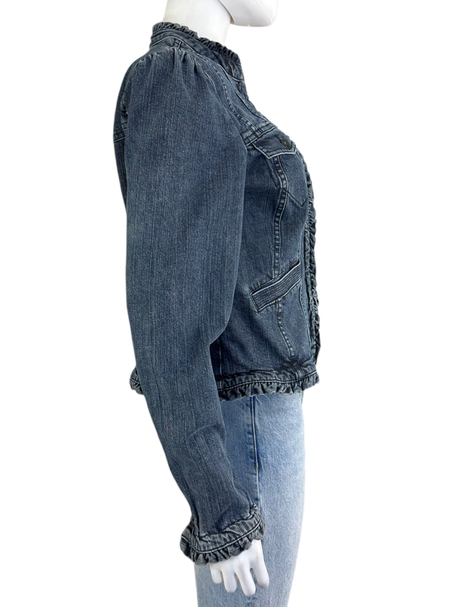 Vintage style dark wash long sleeve denim jacket with ruffle trim.