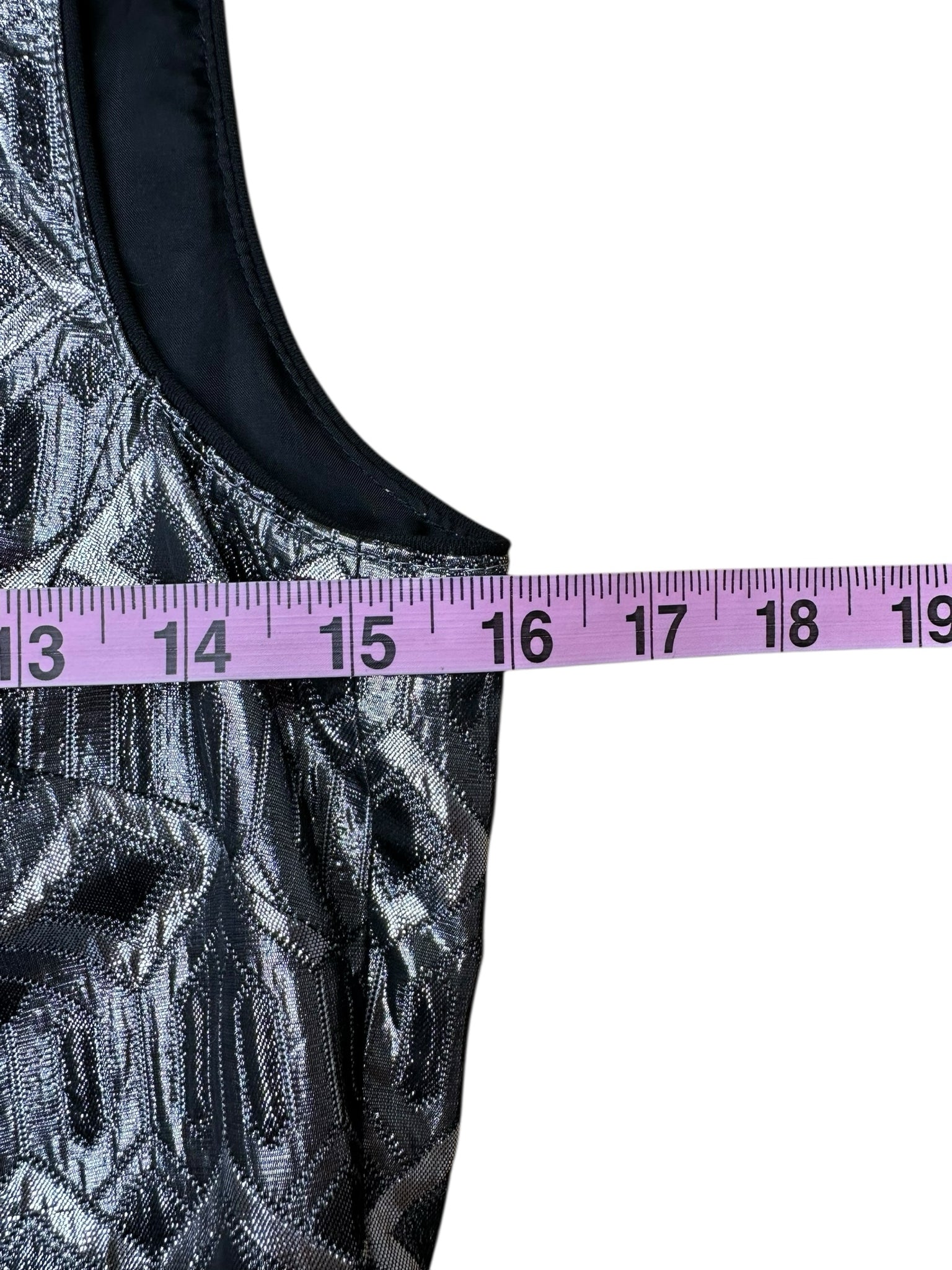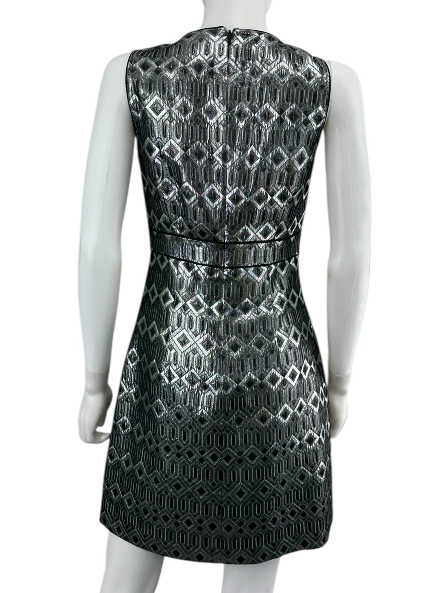 Metallic silver pattern sleeveless cocktail dress with a back zipper closure.