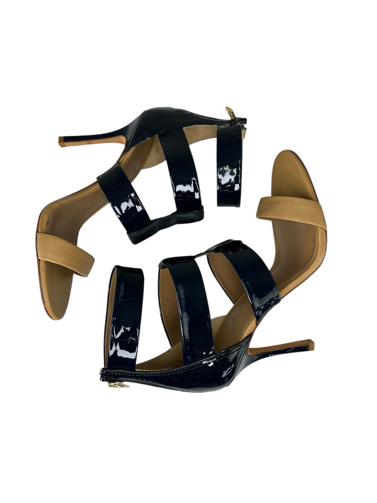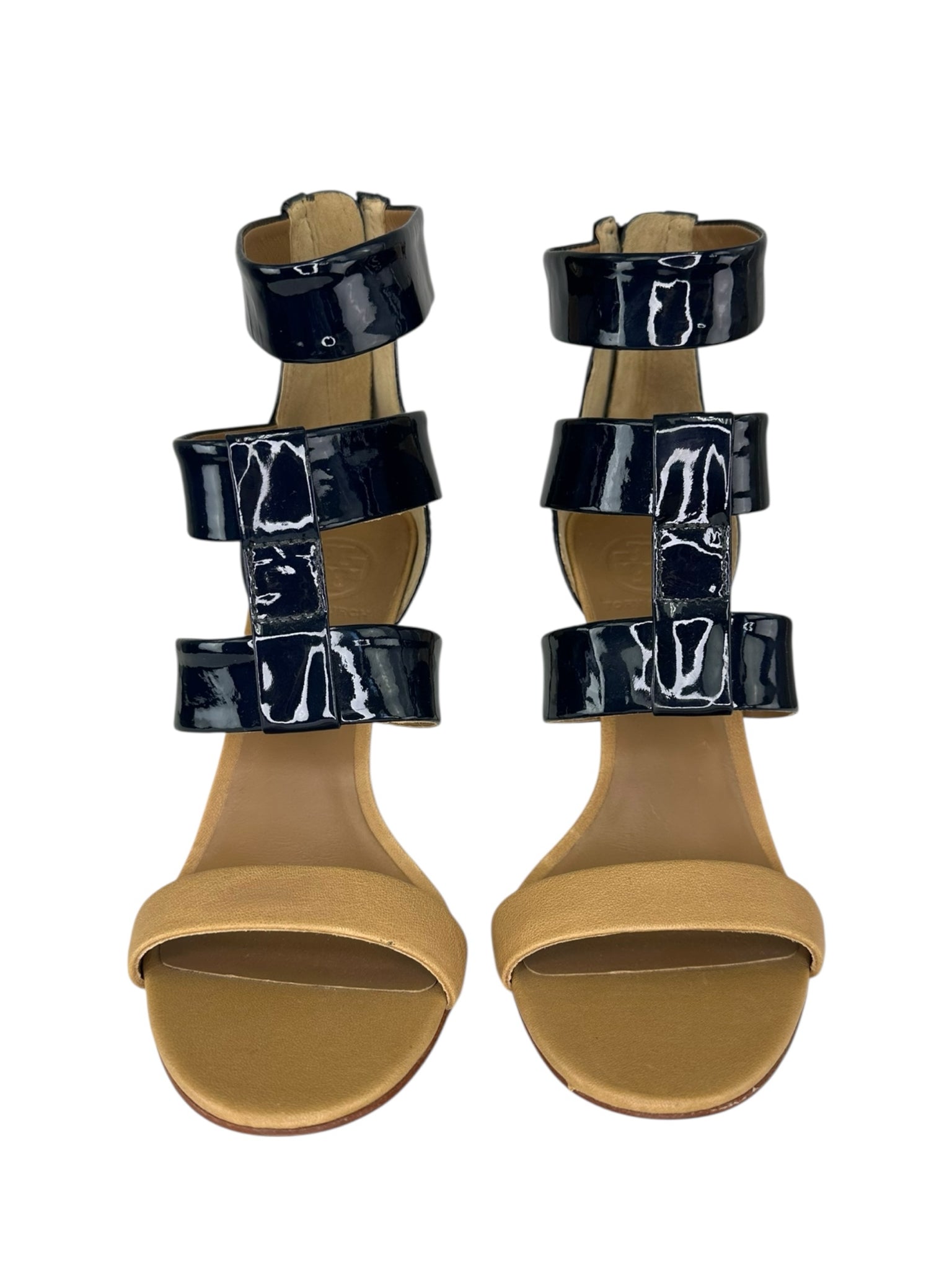 Tan and navy patent leather caged stiletto pumps in near perfect condition. Toes feature a tan leather toe strap with a caged deep navy patent leather ankle strap design. Pumps have a gold zipper closure at heels and a 4.0" stiletto heel. Very minimal signs of wear present to sole of shoe as pictured.