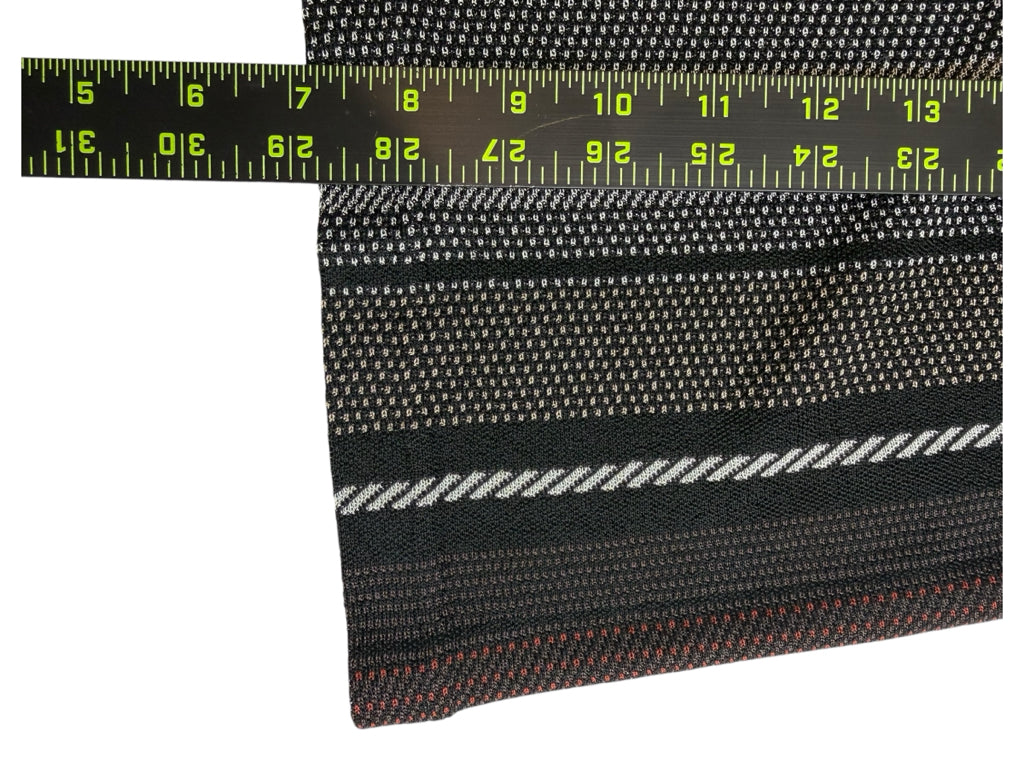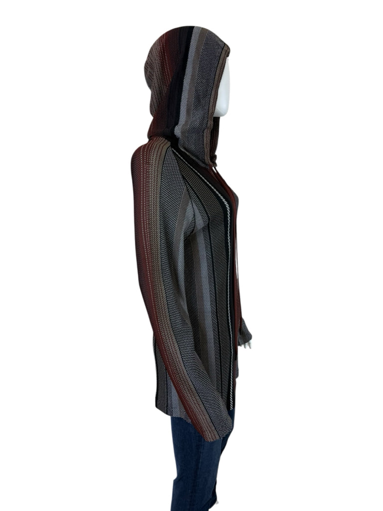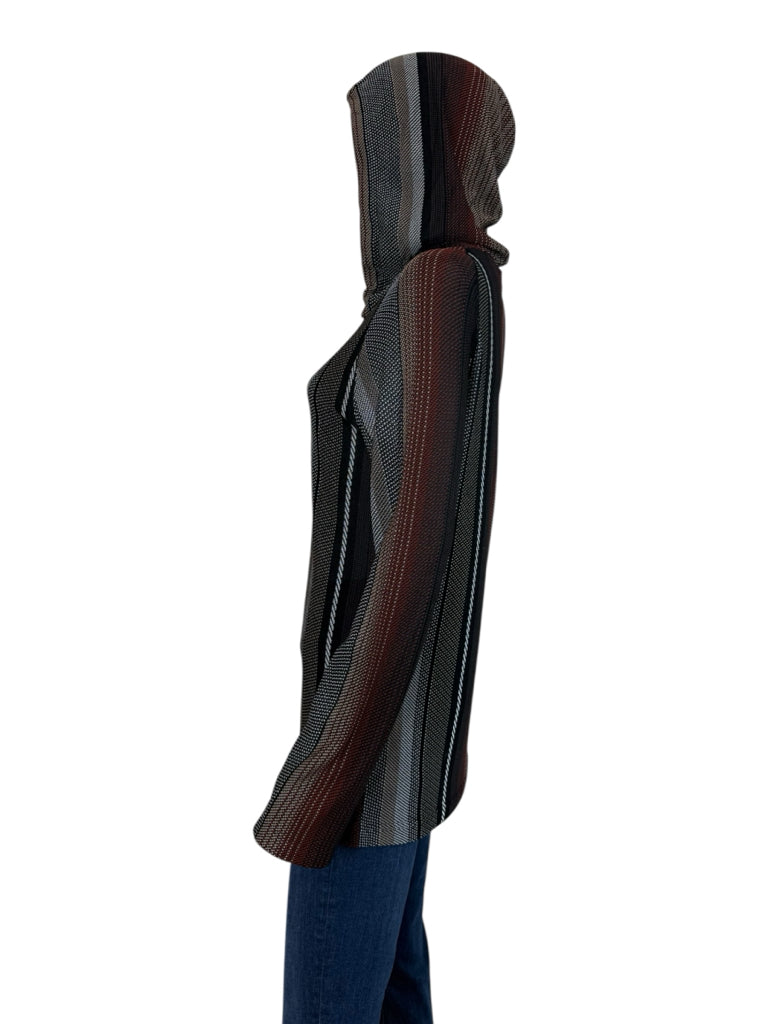 Multi-colored black, brown, maroon striped bohemian baja inspired hoodie with long sleeves and adjustable tie closure at neck.