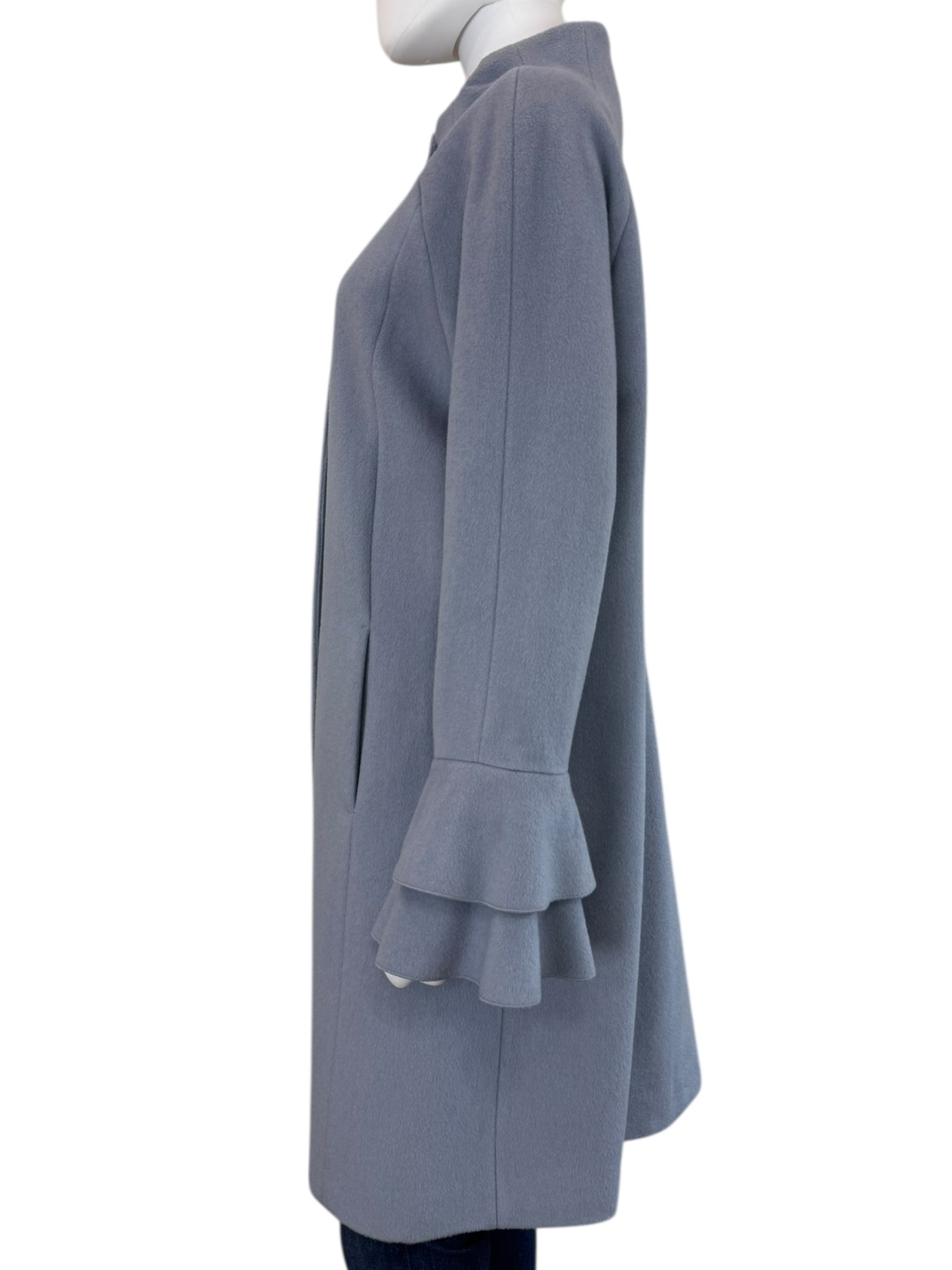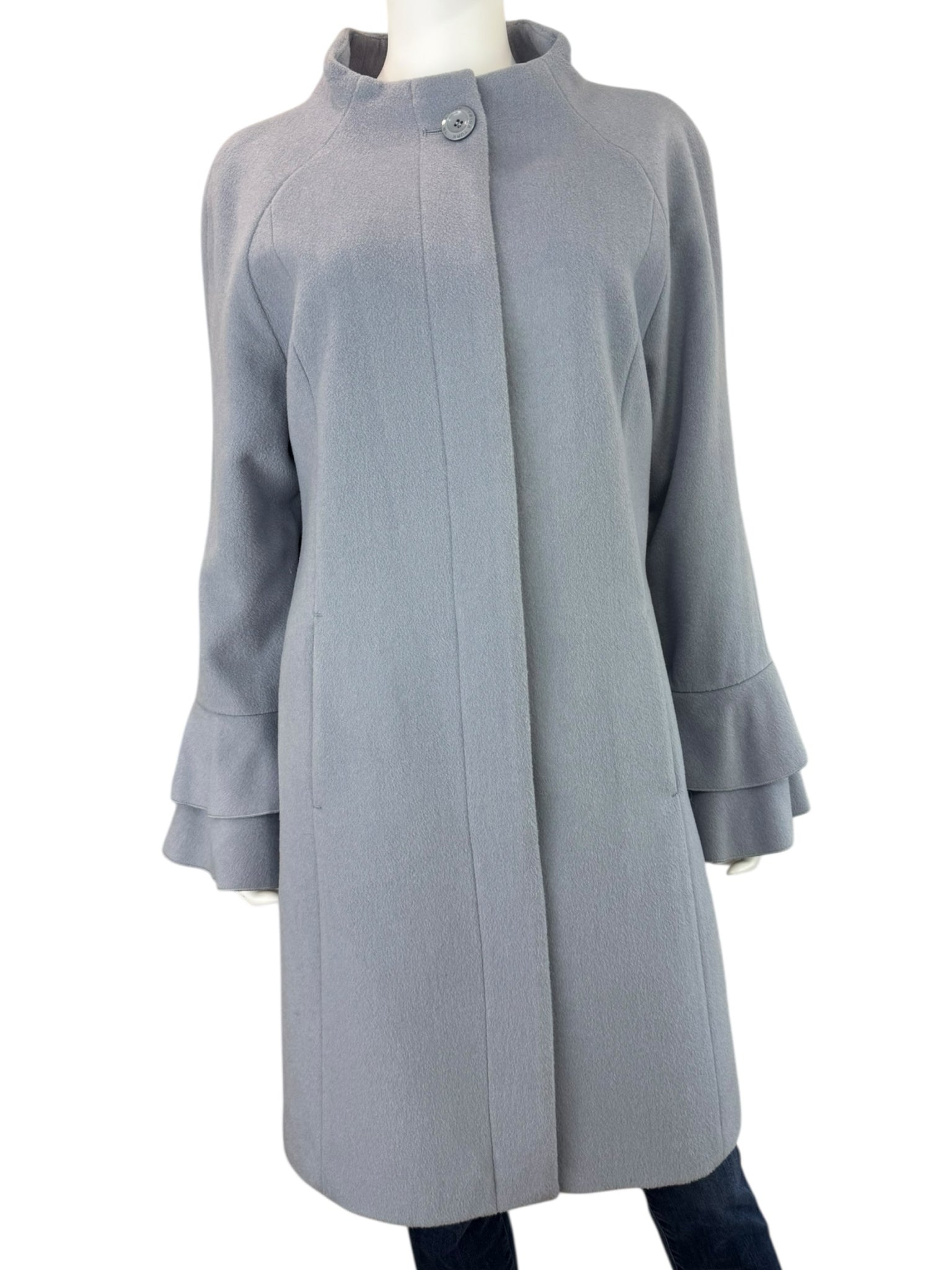 Super warm and cozy light gray wool blend coat with long ruffle cuff sleeves, front pockets, button closure at neck and a front hidden button closure.