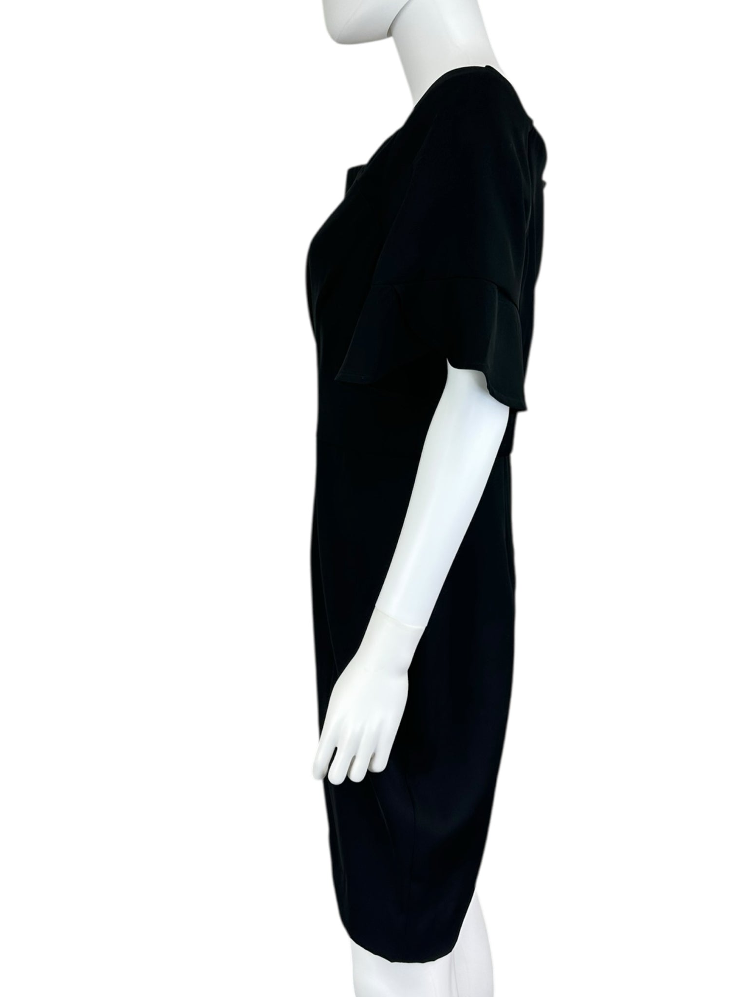 Black off the shoulder cocktail dress with elbow length ruffle sleeves and back zipper/hook closure. Dress is lined and falls above the knees. Fabric content tag is not present.