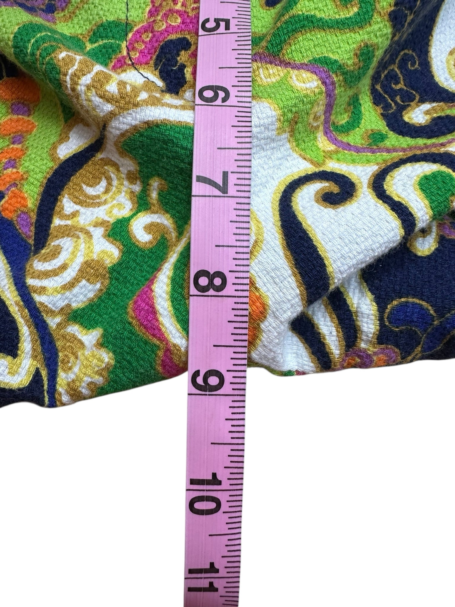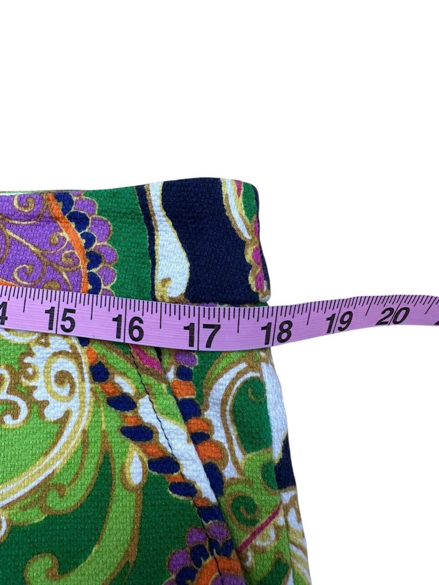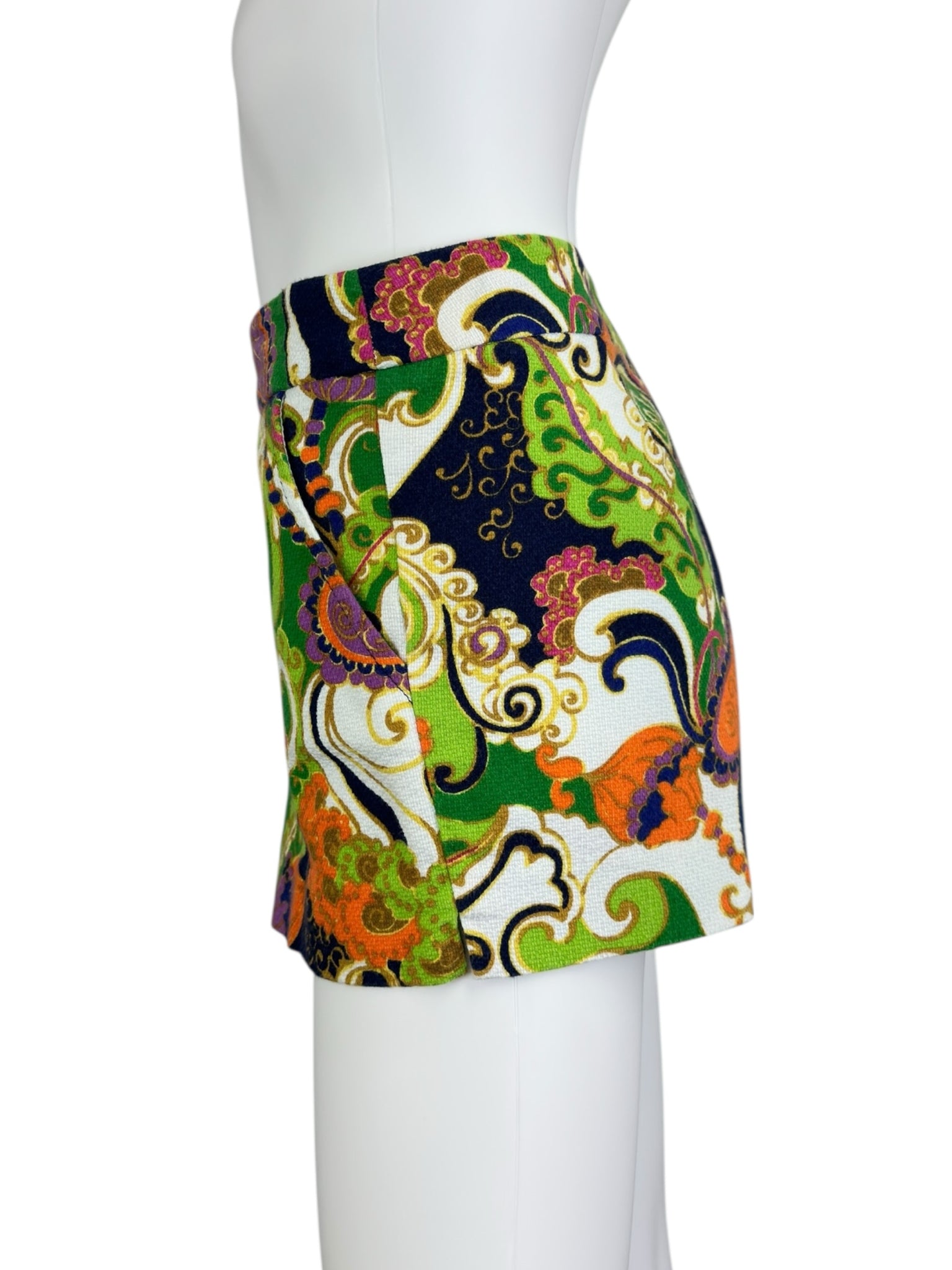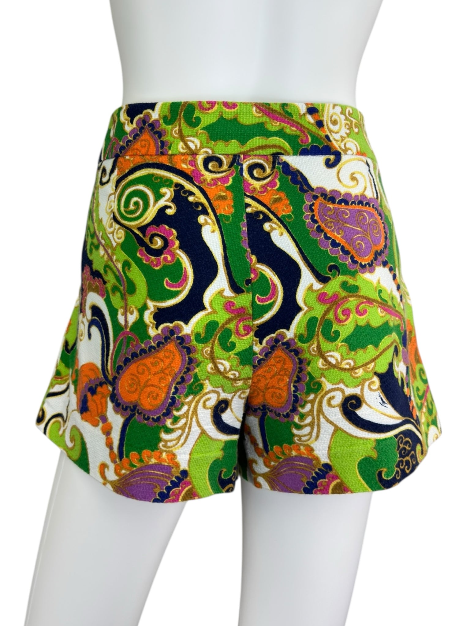 New with tags! Green, orange, navy & purple paisley print mini shorts with zip/button closure and pockets.