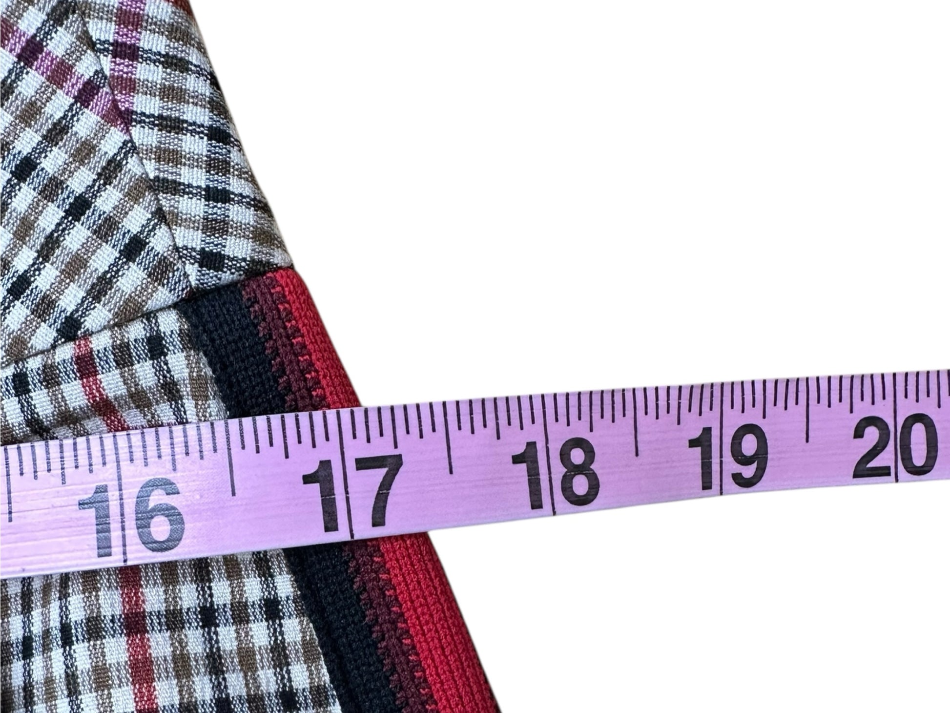 Tan, olive, red and black plaid joggers with a side stripe panel, front pockets and a front zipper and double hook closure.