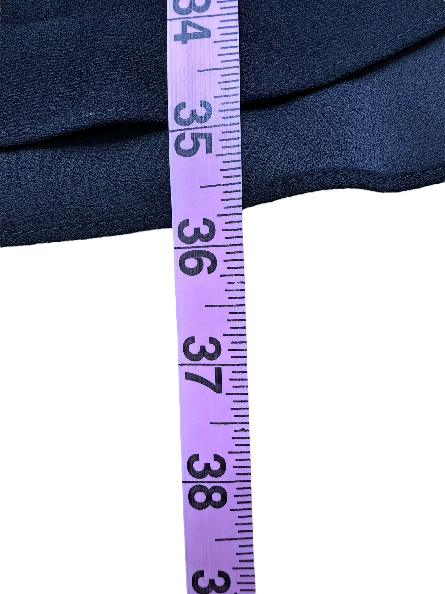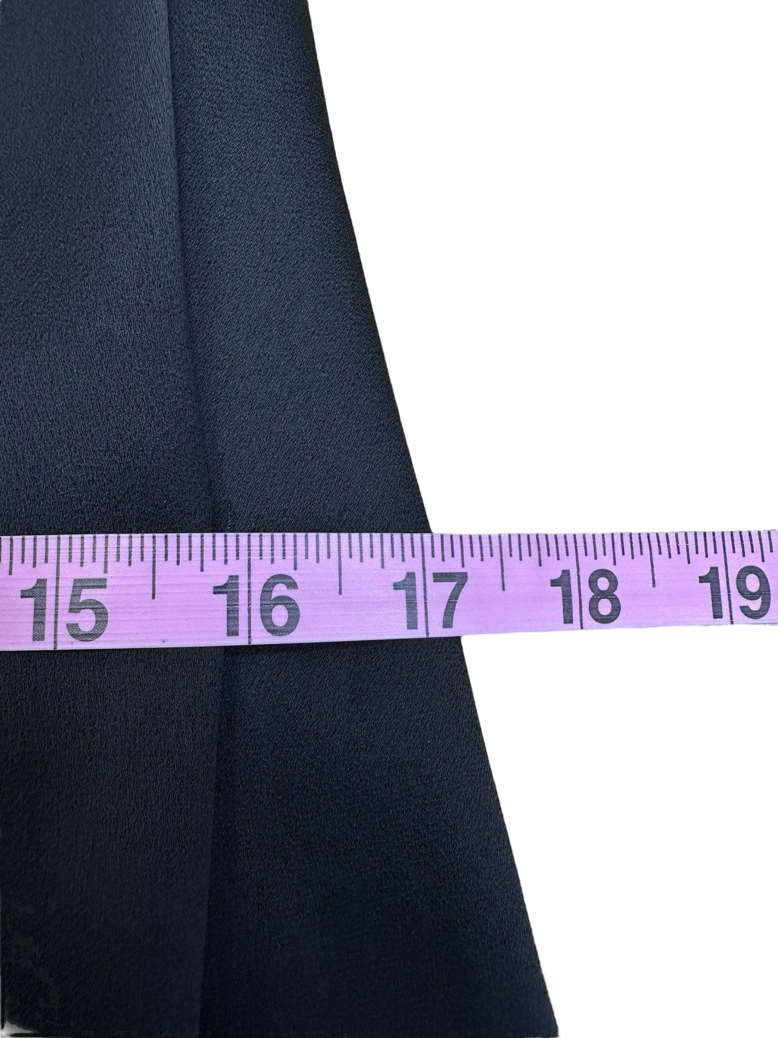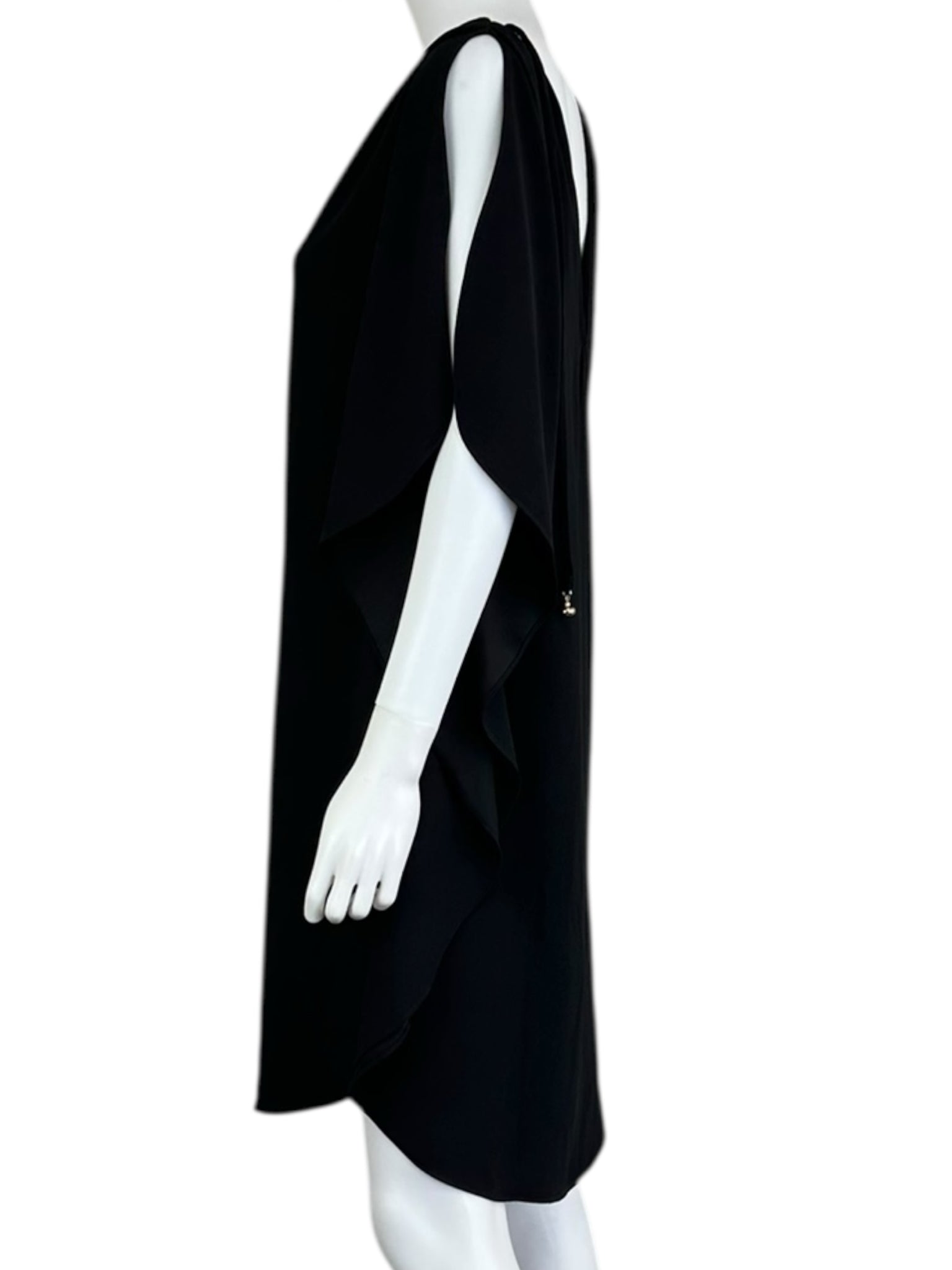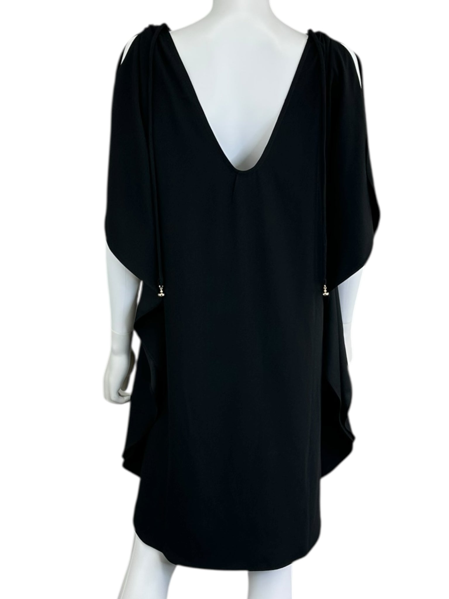 New with tags! Black knee length minidress crafted from flowing fabric with flared sleeves and a round hemline. Dress feathers a V-neck opening and tie closure across the back.