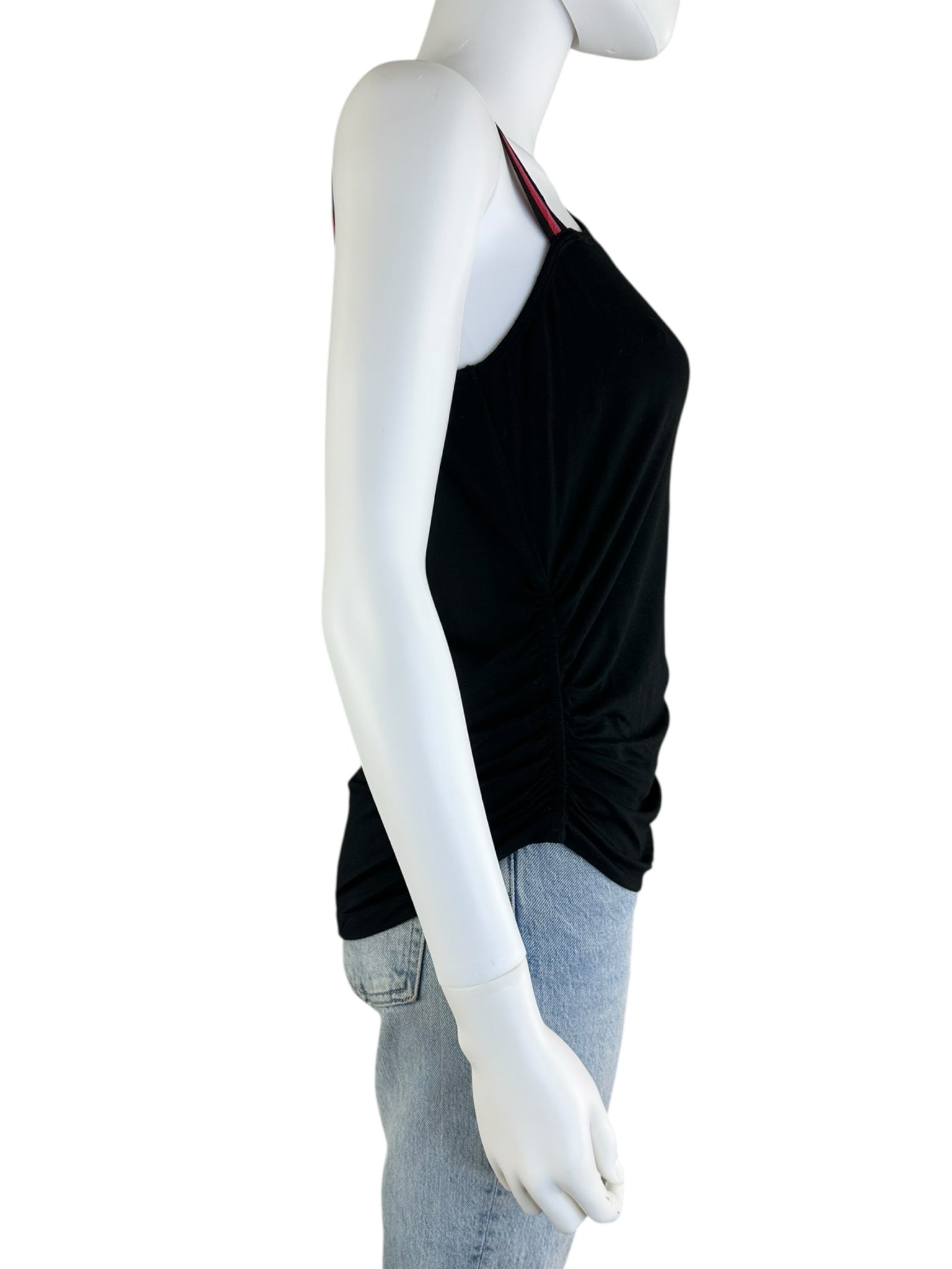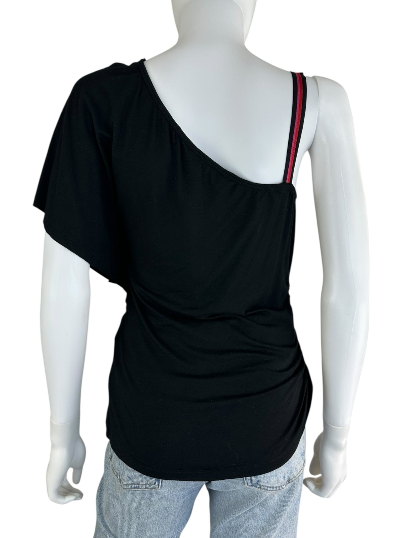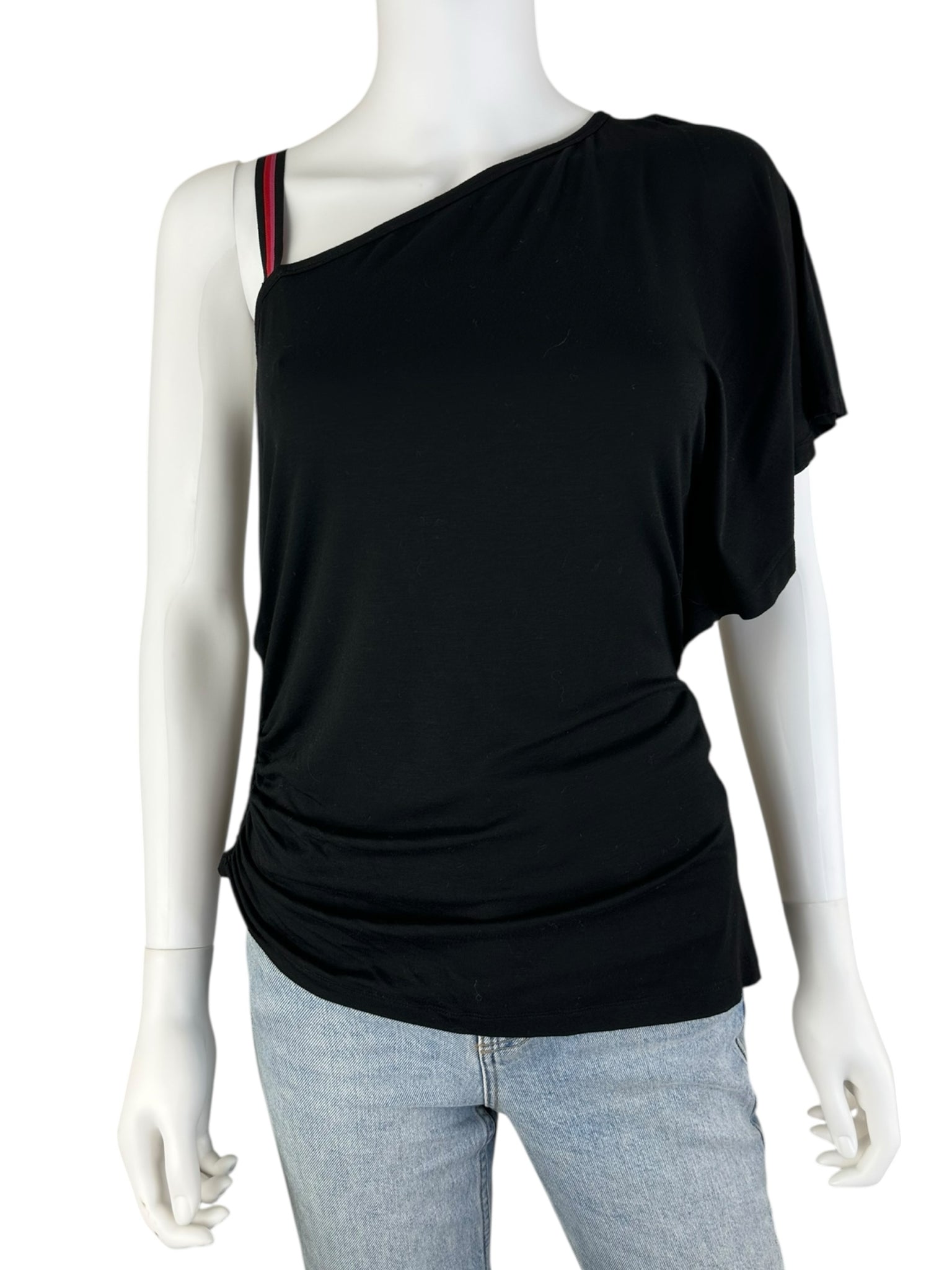 Short sleeve black one shoulder top with a hot pink and red striped strap. Top is made from a comfy stretch knit fabric.