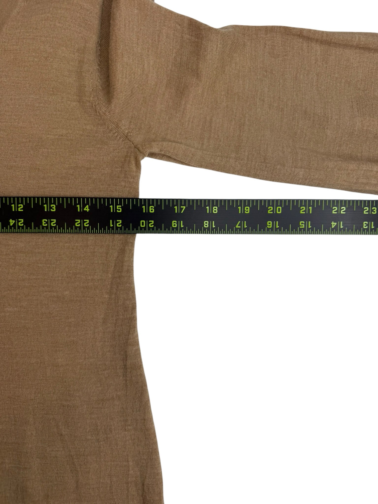 100% merino wool tan v neck long sleeve.