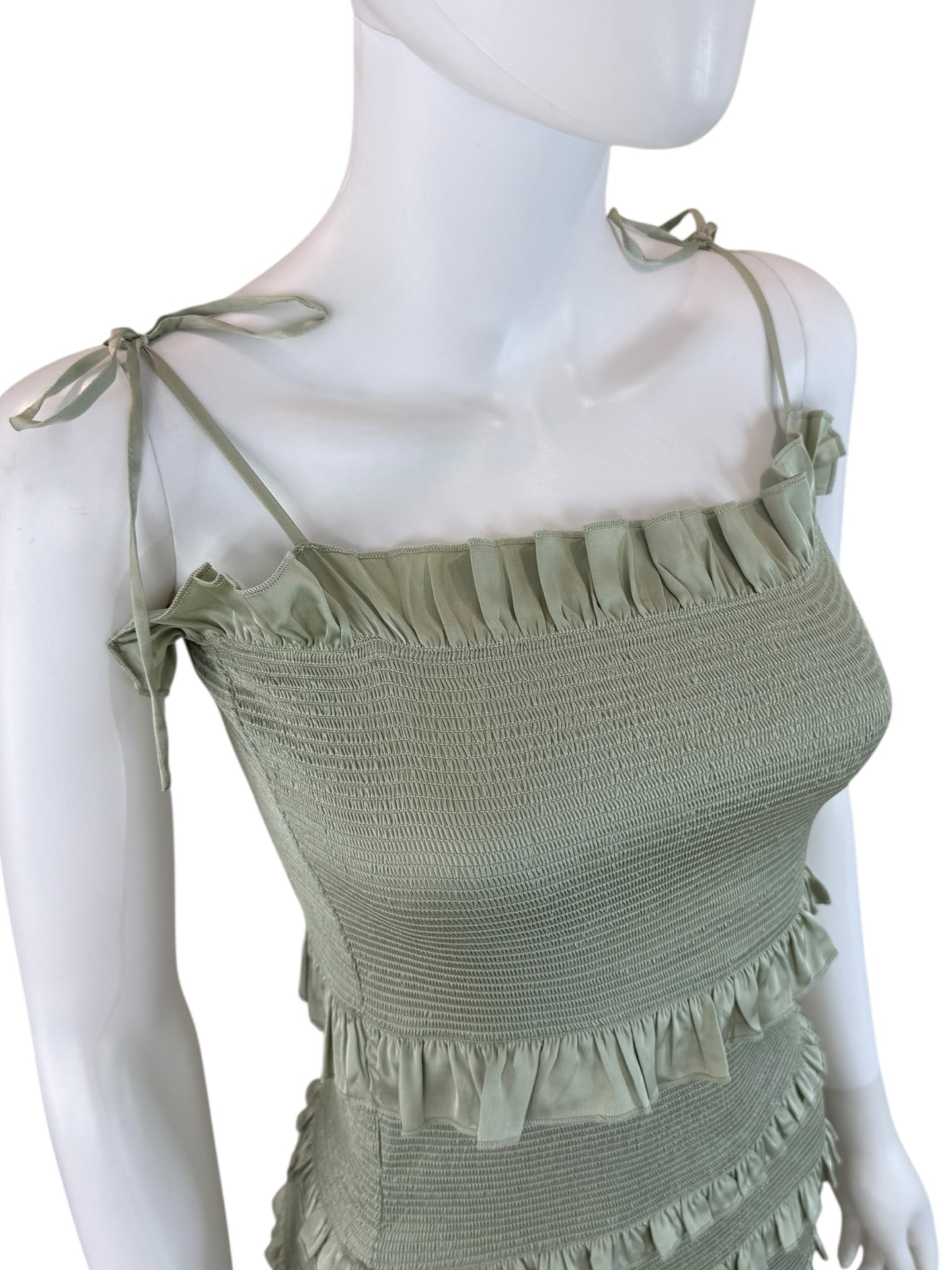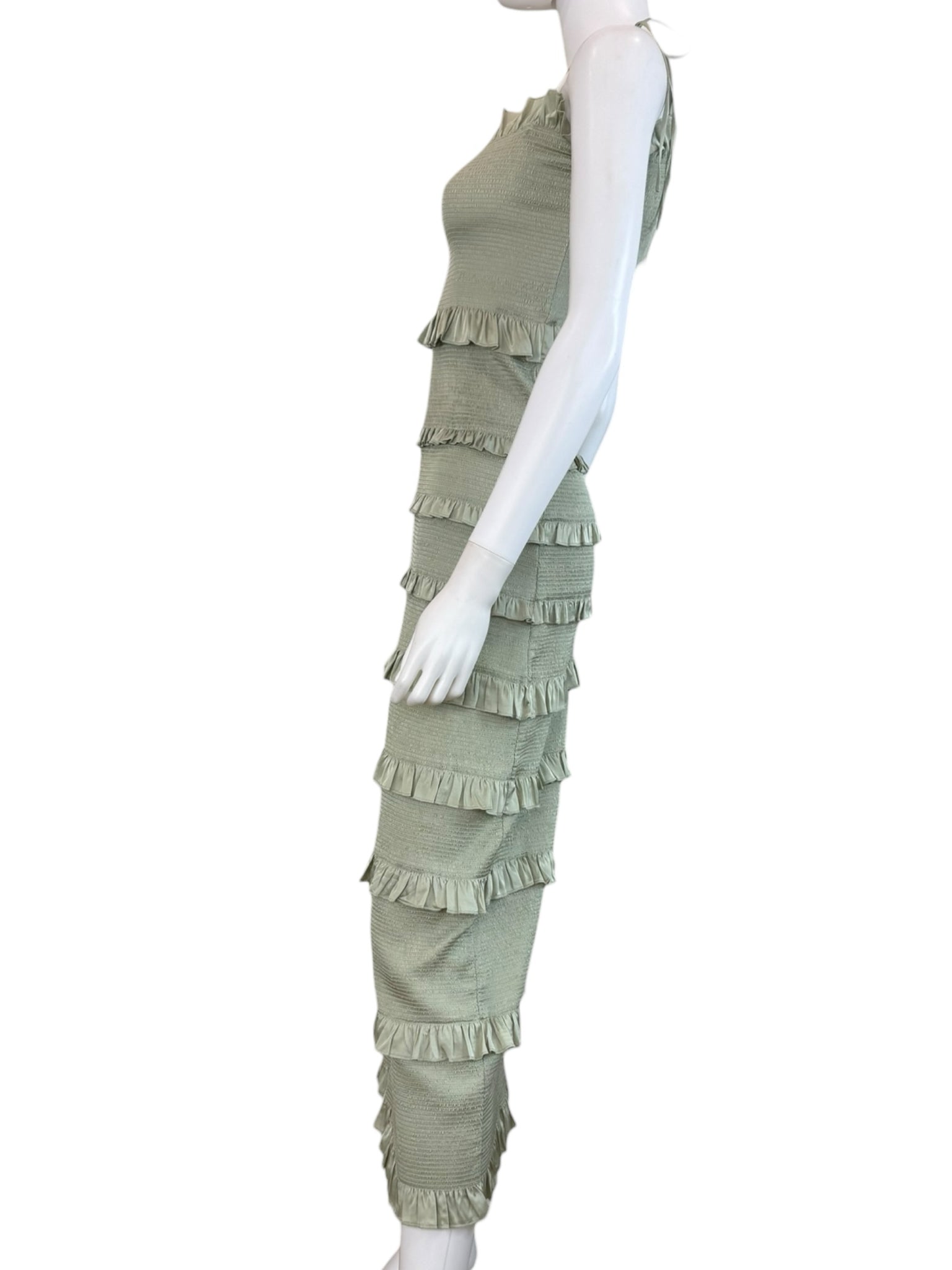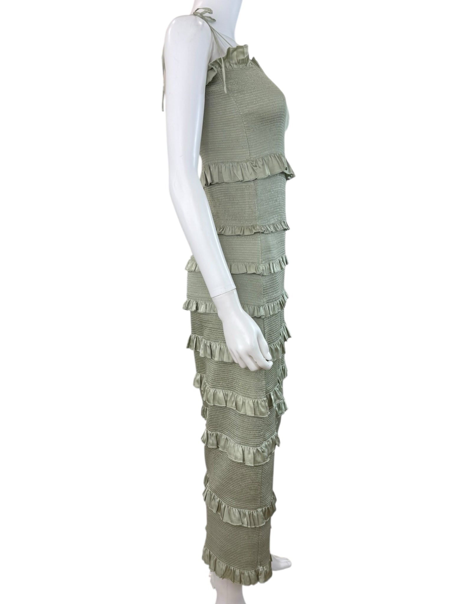 Sage green satin smocked ruffle trim maxi with tie closure at shoulders.