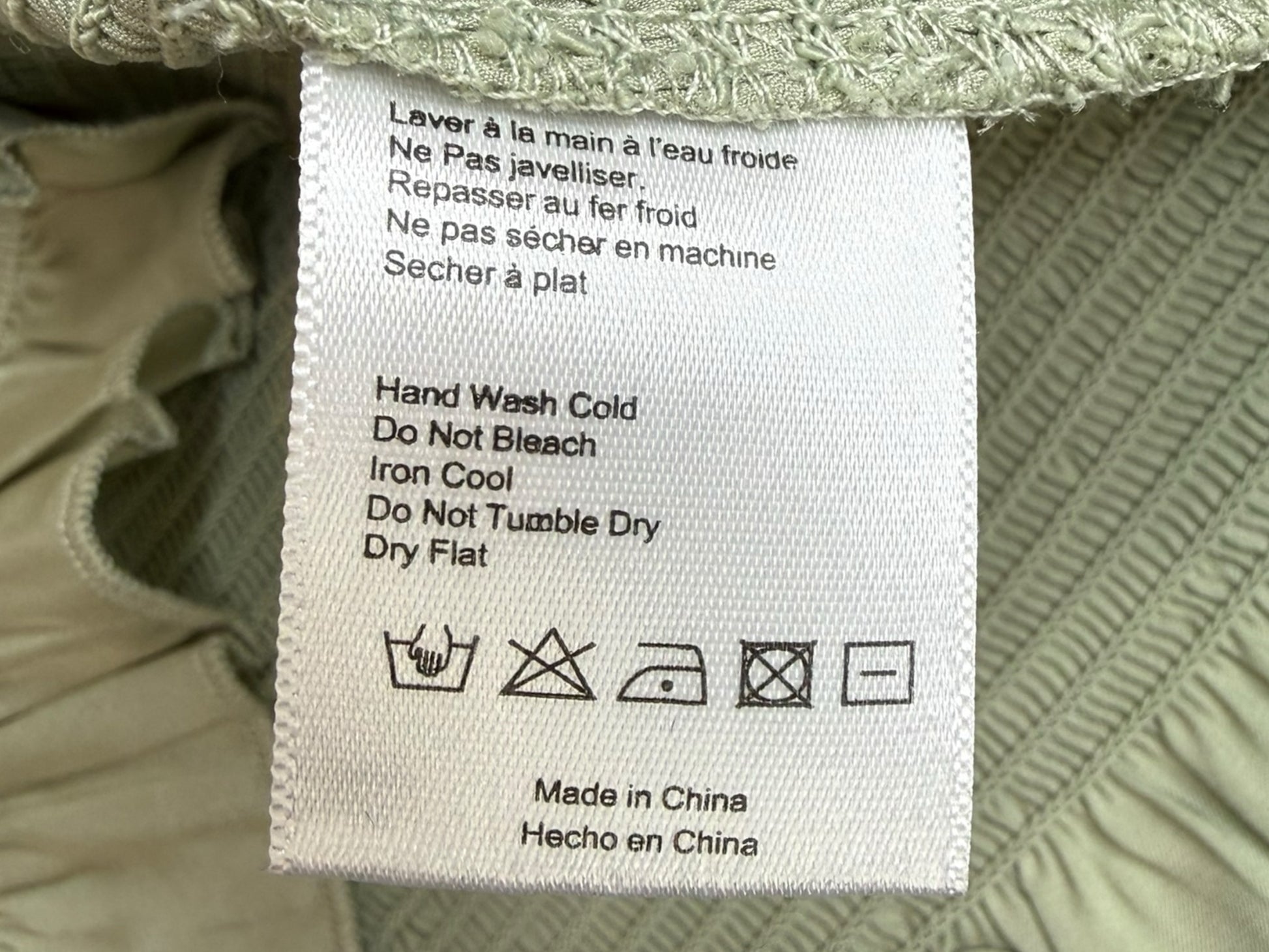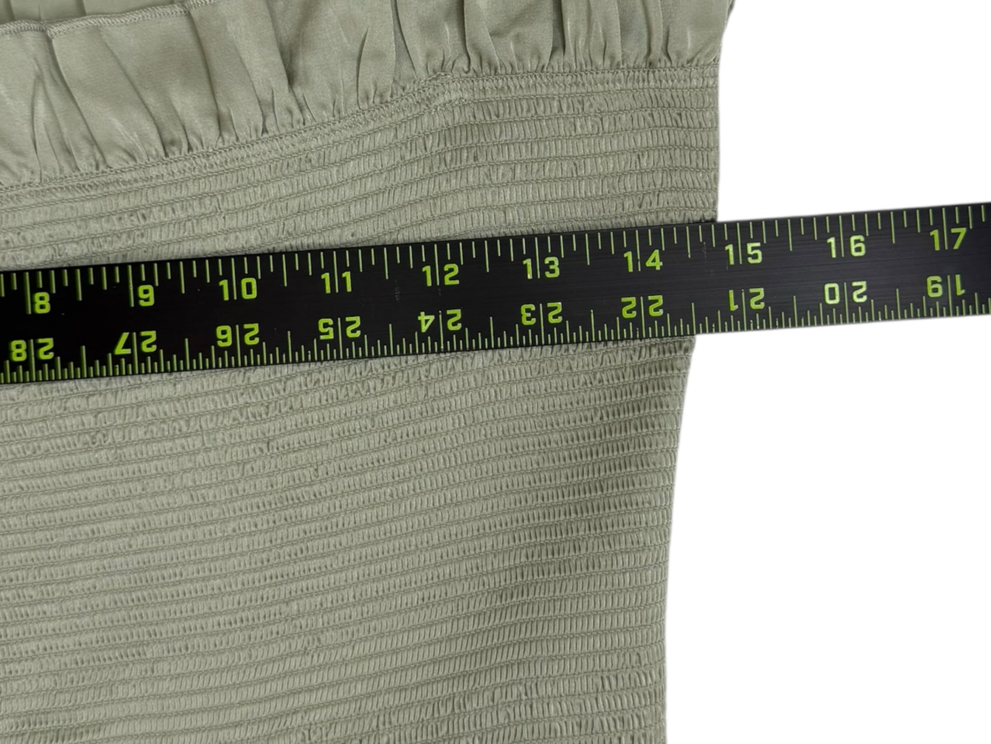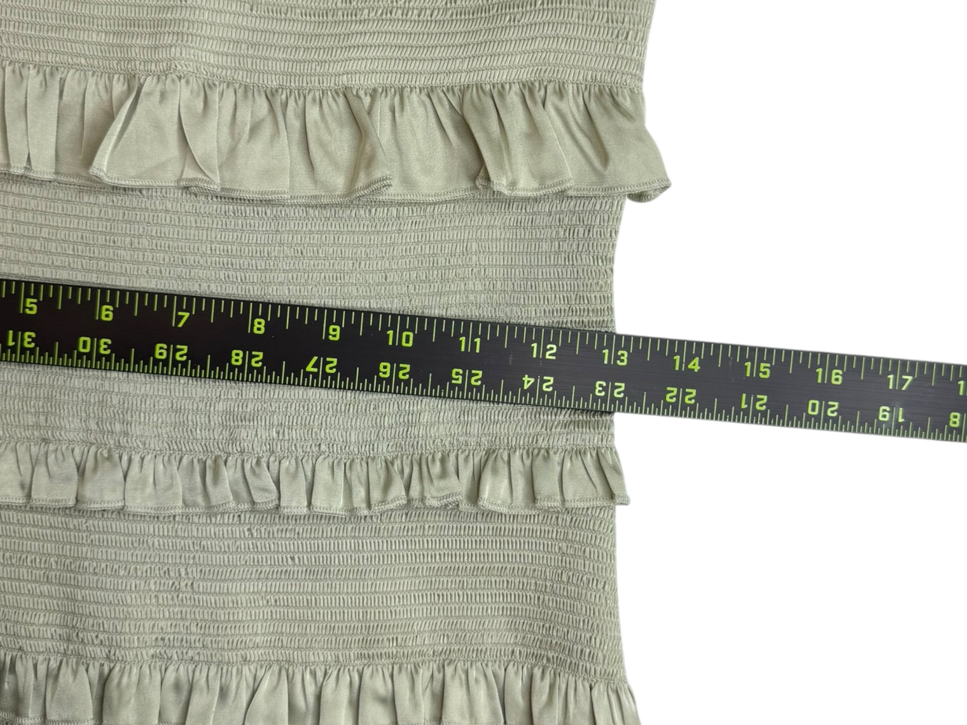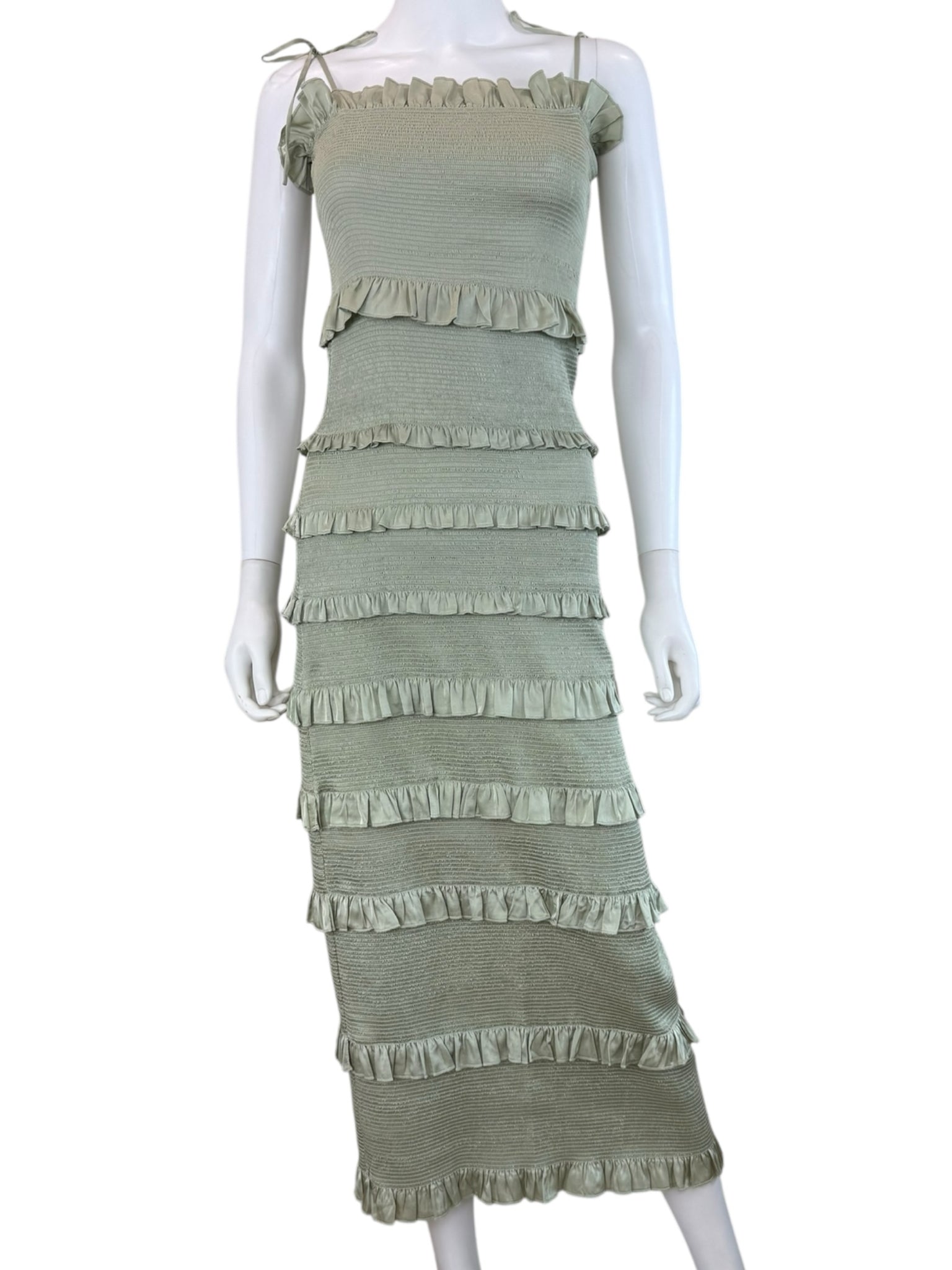 Sage green satin smocked ruffle trim maxi with tie closure at shoulders.