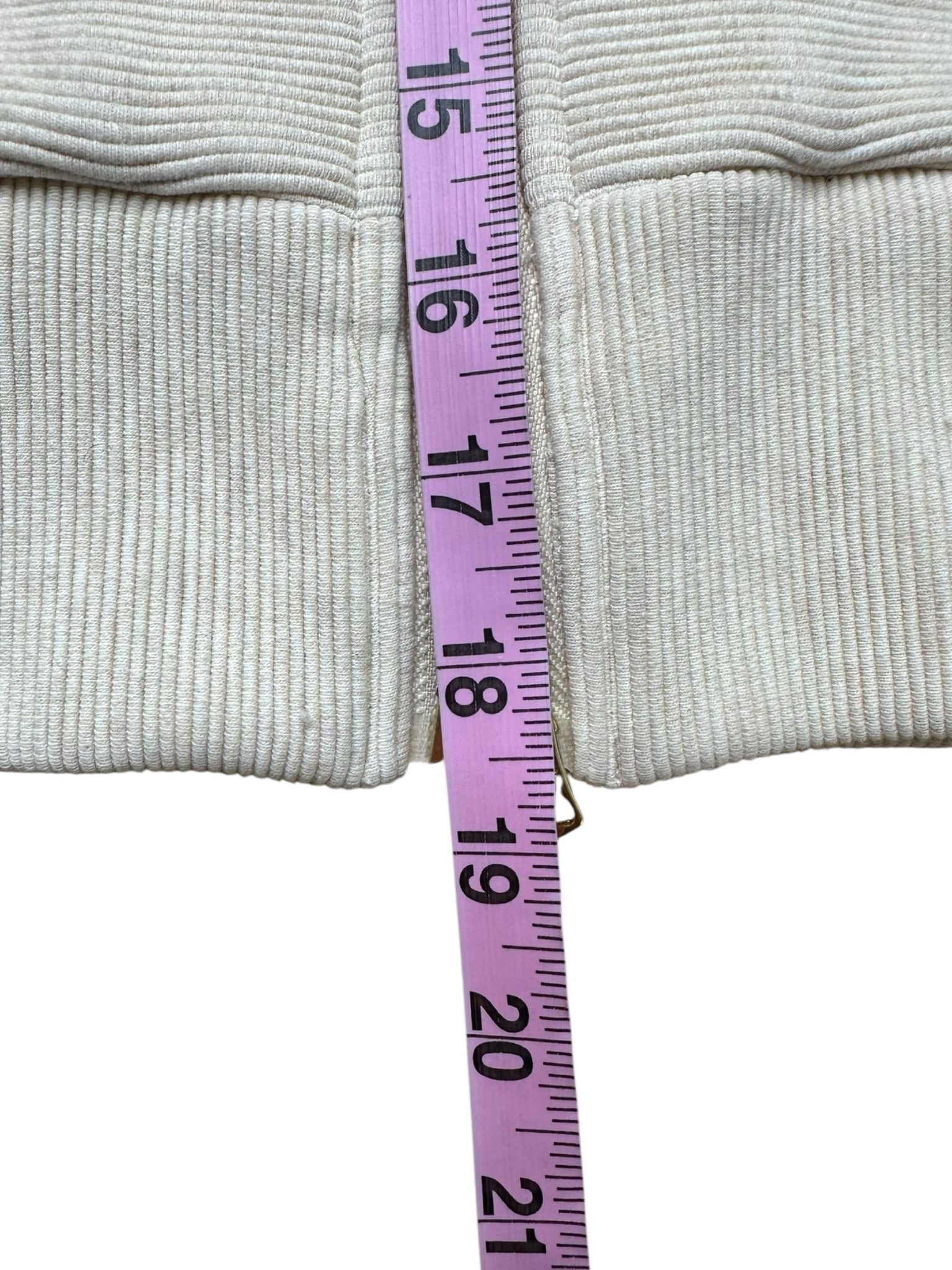 Cream ribbed stretch knit jacket with long sleeves, front pockets and a front zipper closure.