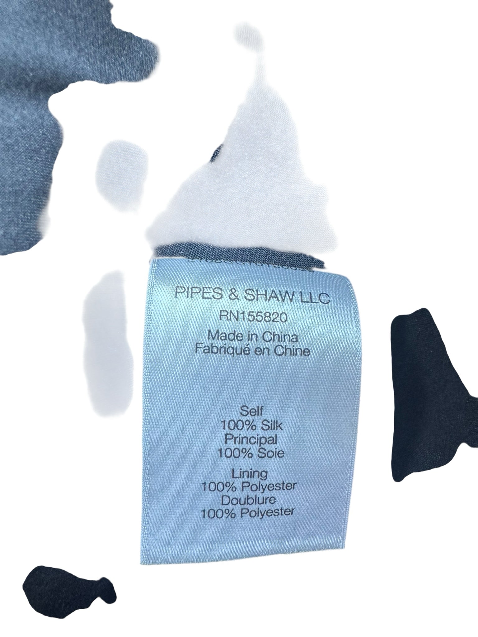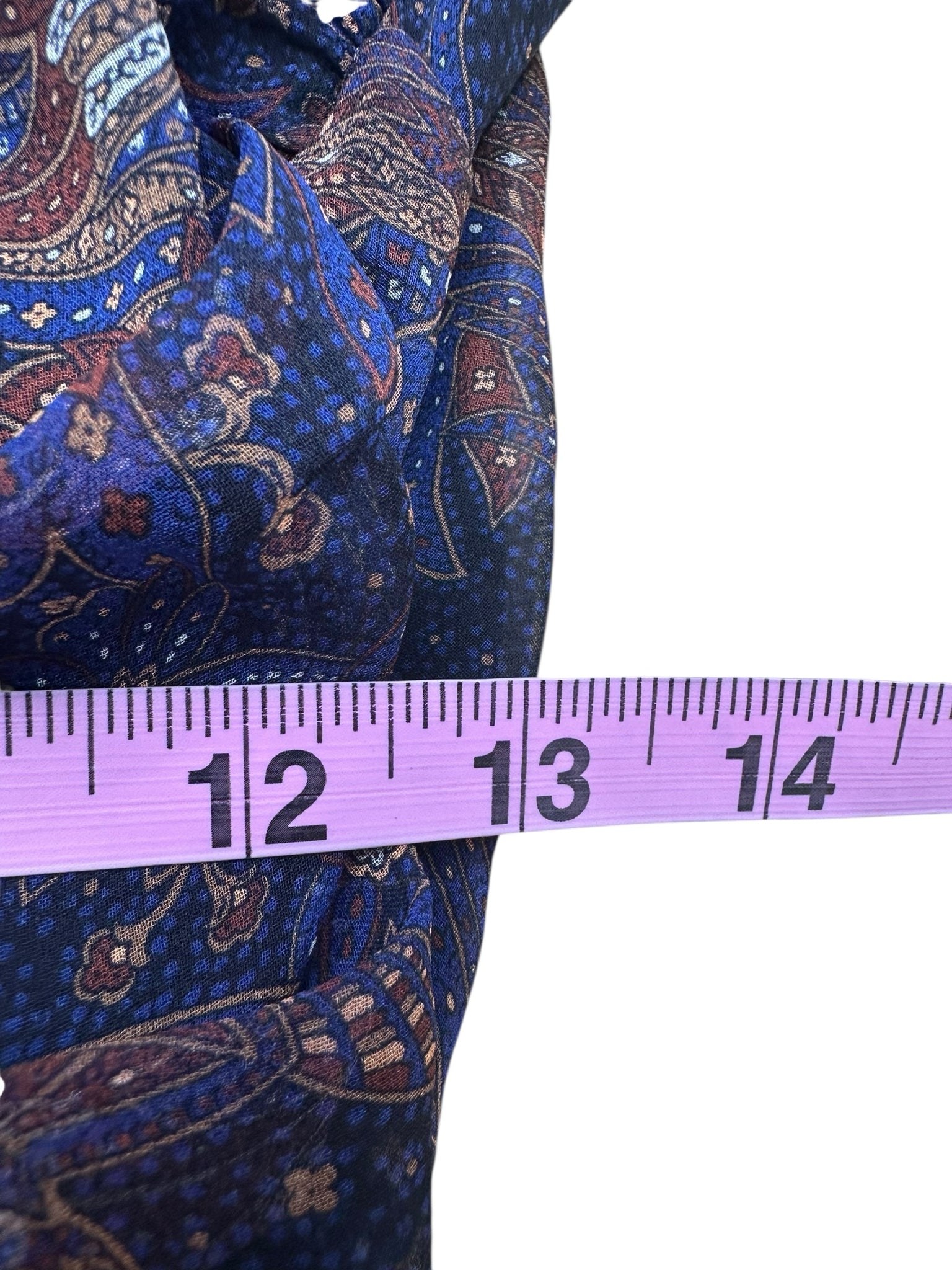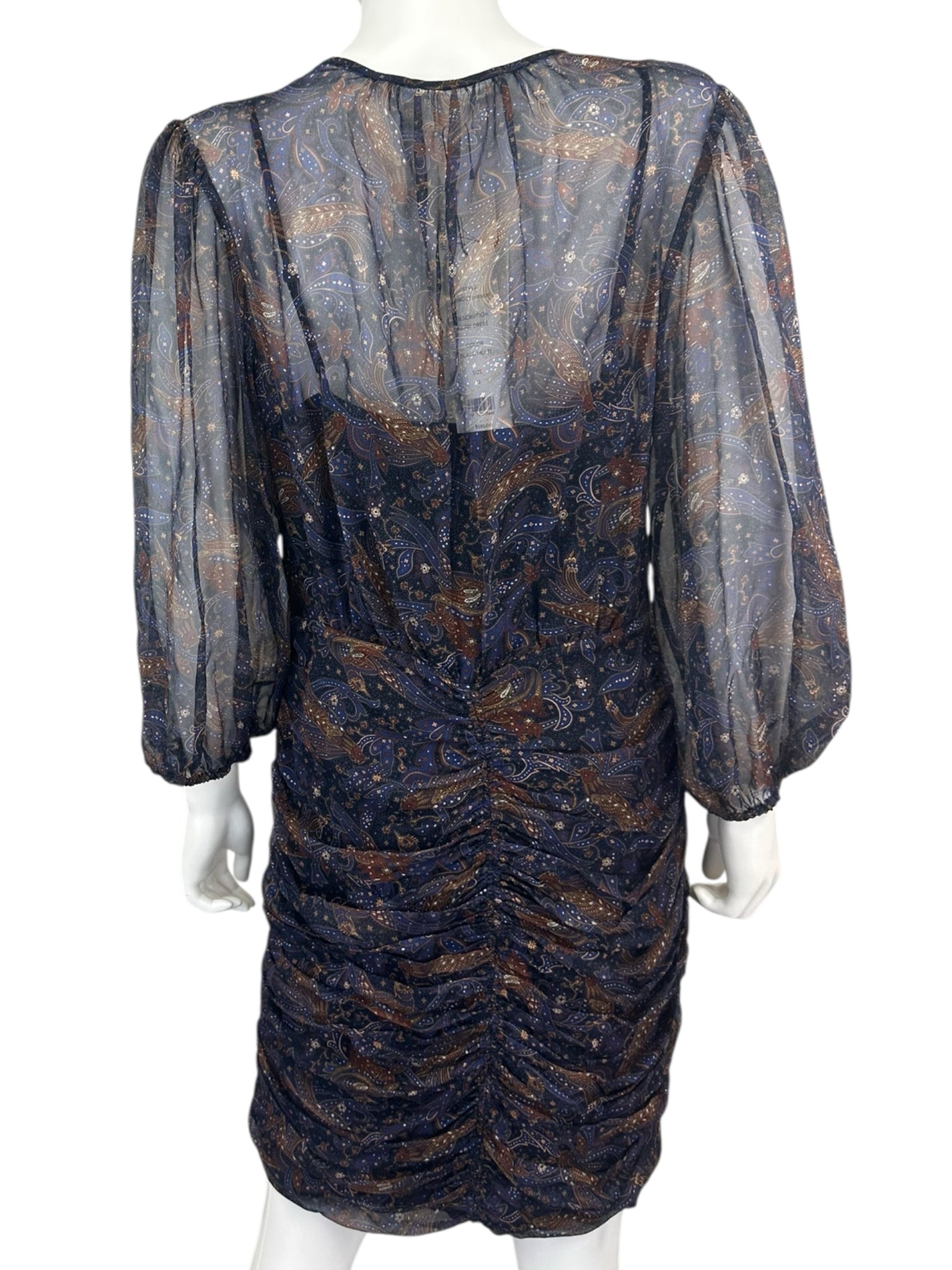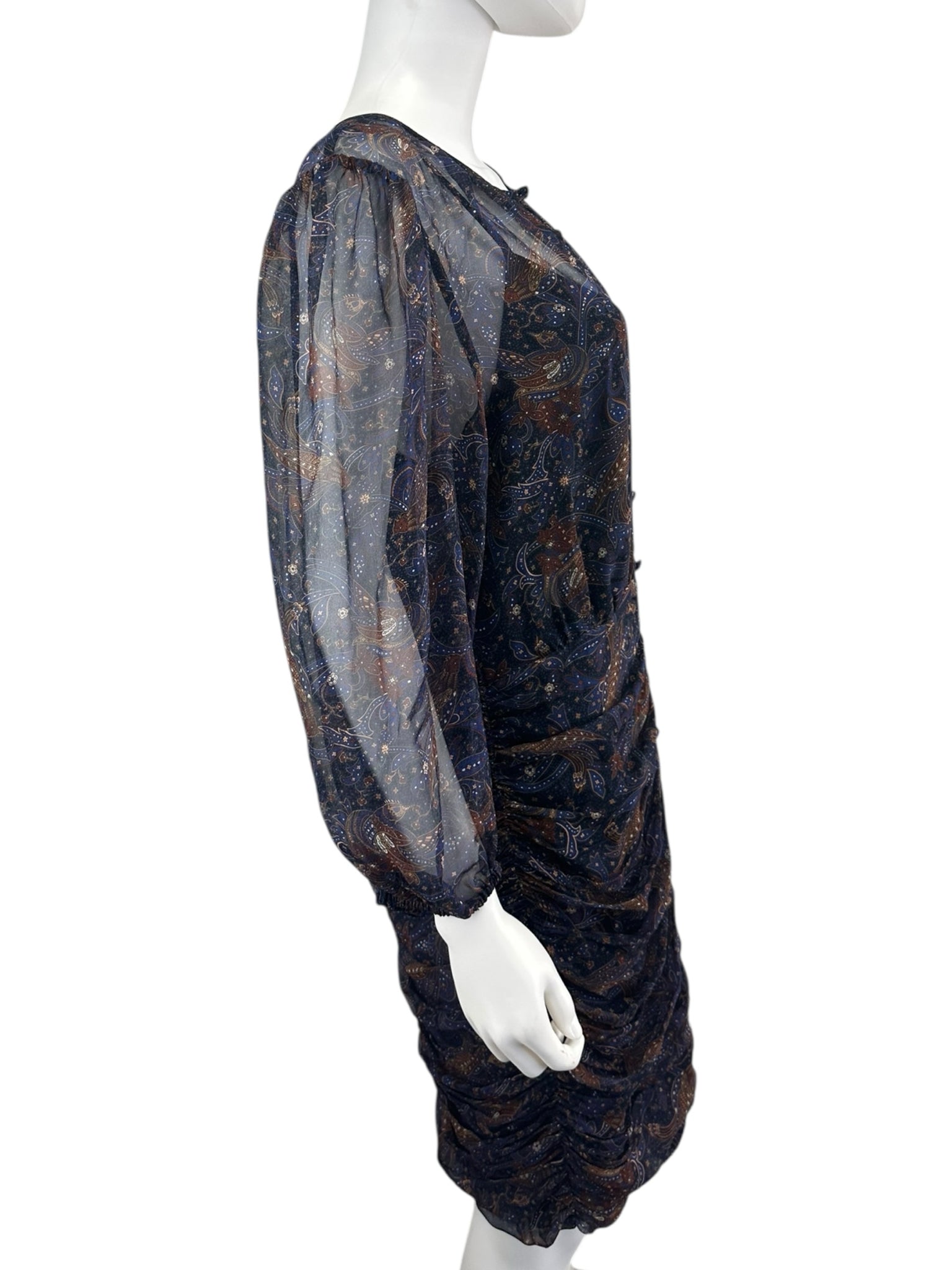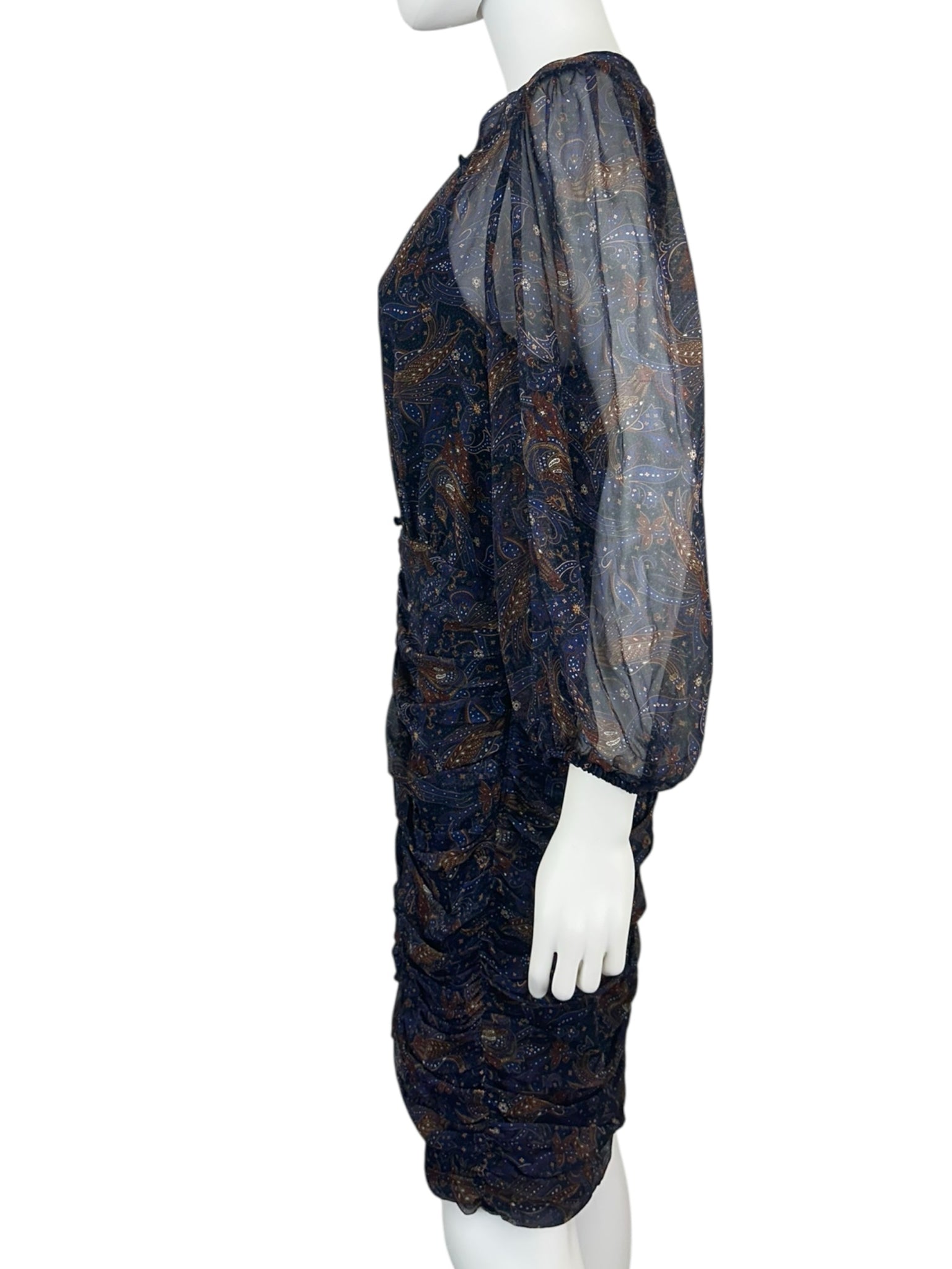 Navy blue 100% silk paisley print 'Kerri' cocktail dress. Dress features long seimi-sheer sleeves, adjustable strap slip and a button front closure.