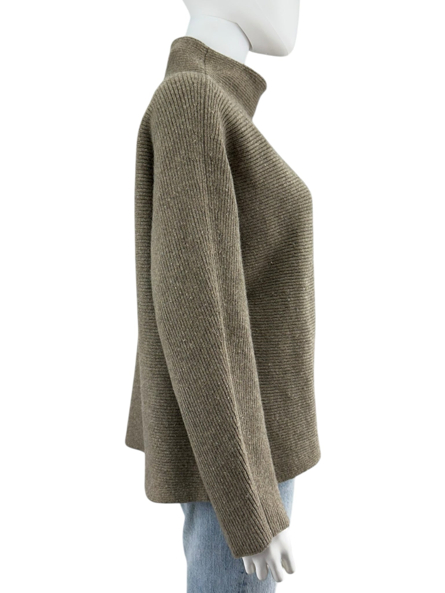 Brown cropped horizontal rib mock neck sweater with long sleeves. Sweater is made from a wool & cashmere blend fabric.