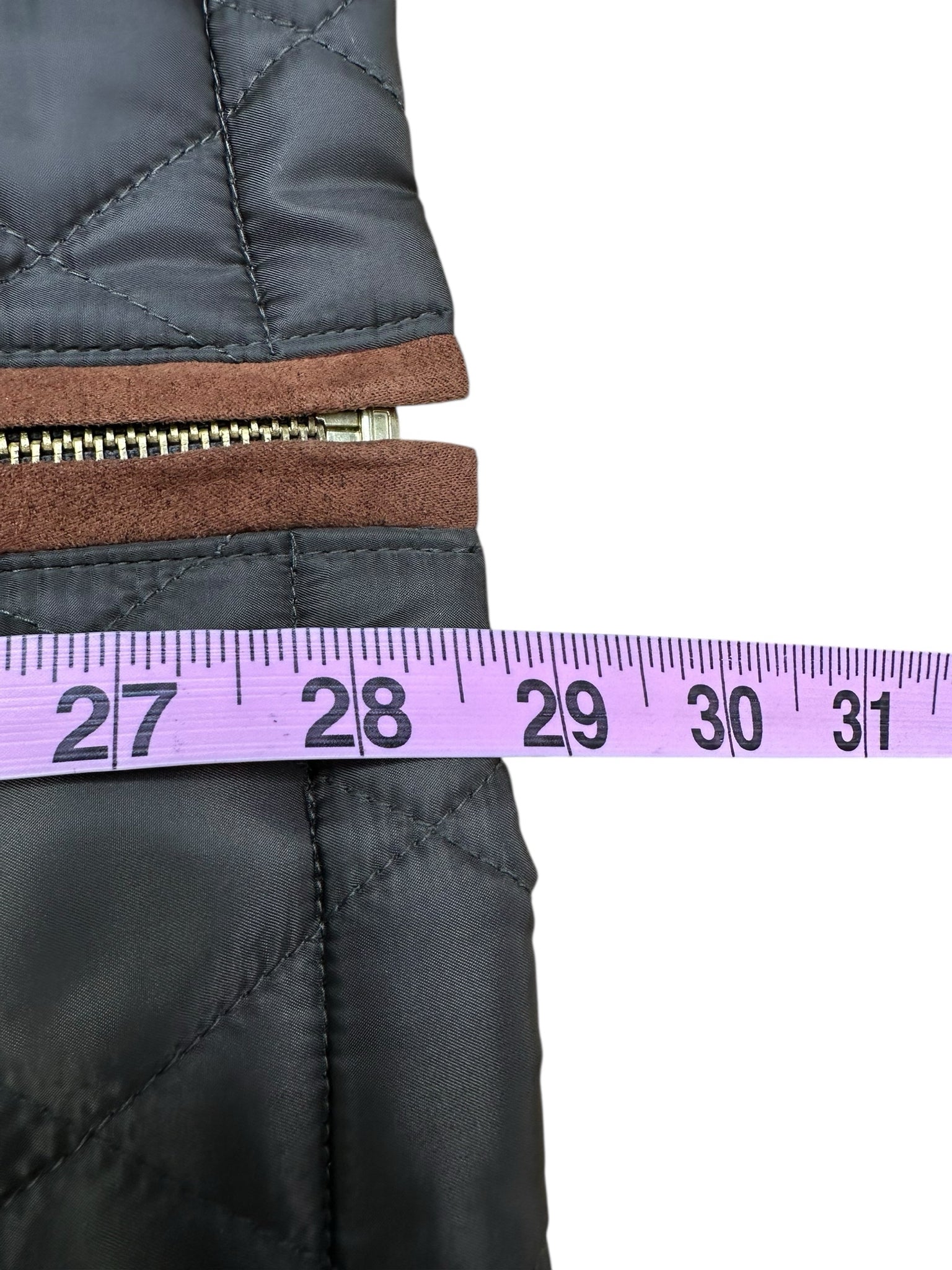 hunter green quilted w carmel brown suede detail w belt gold bttns full zip