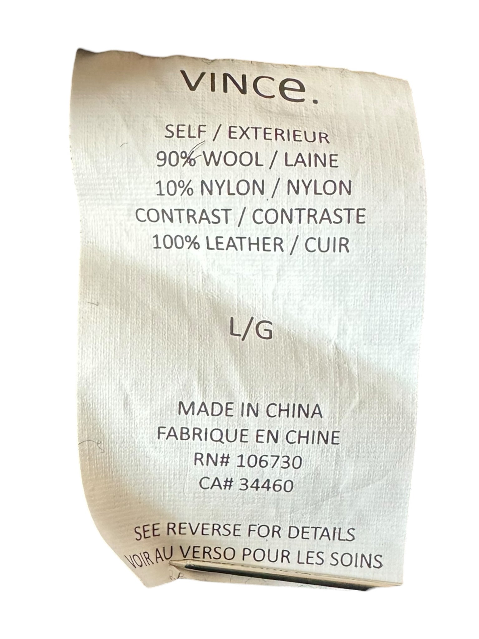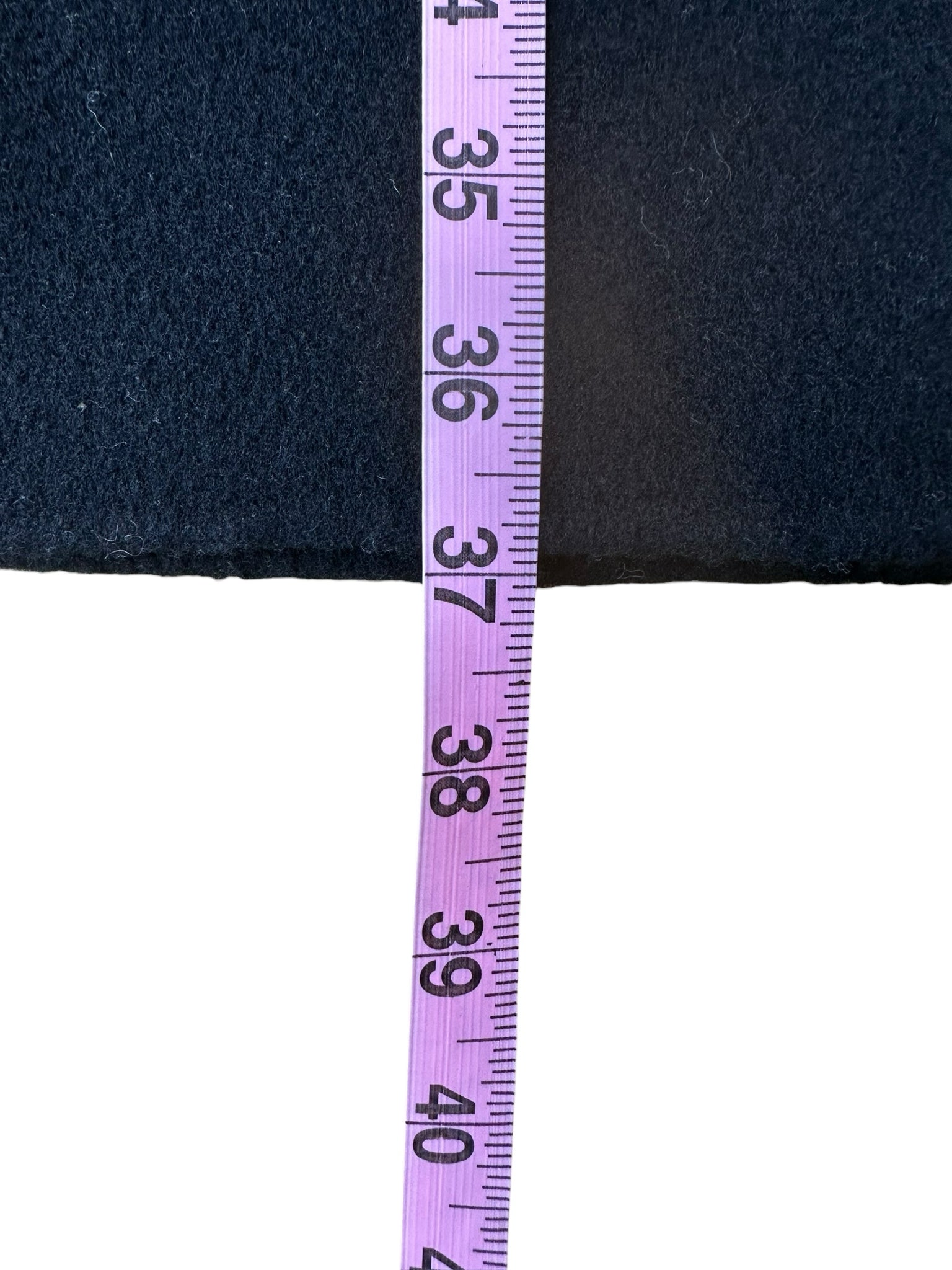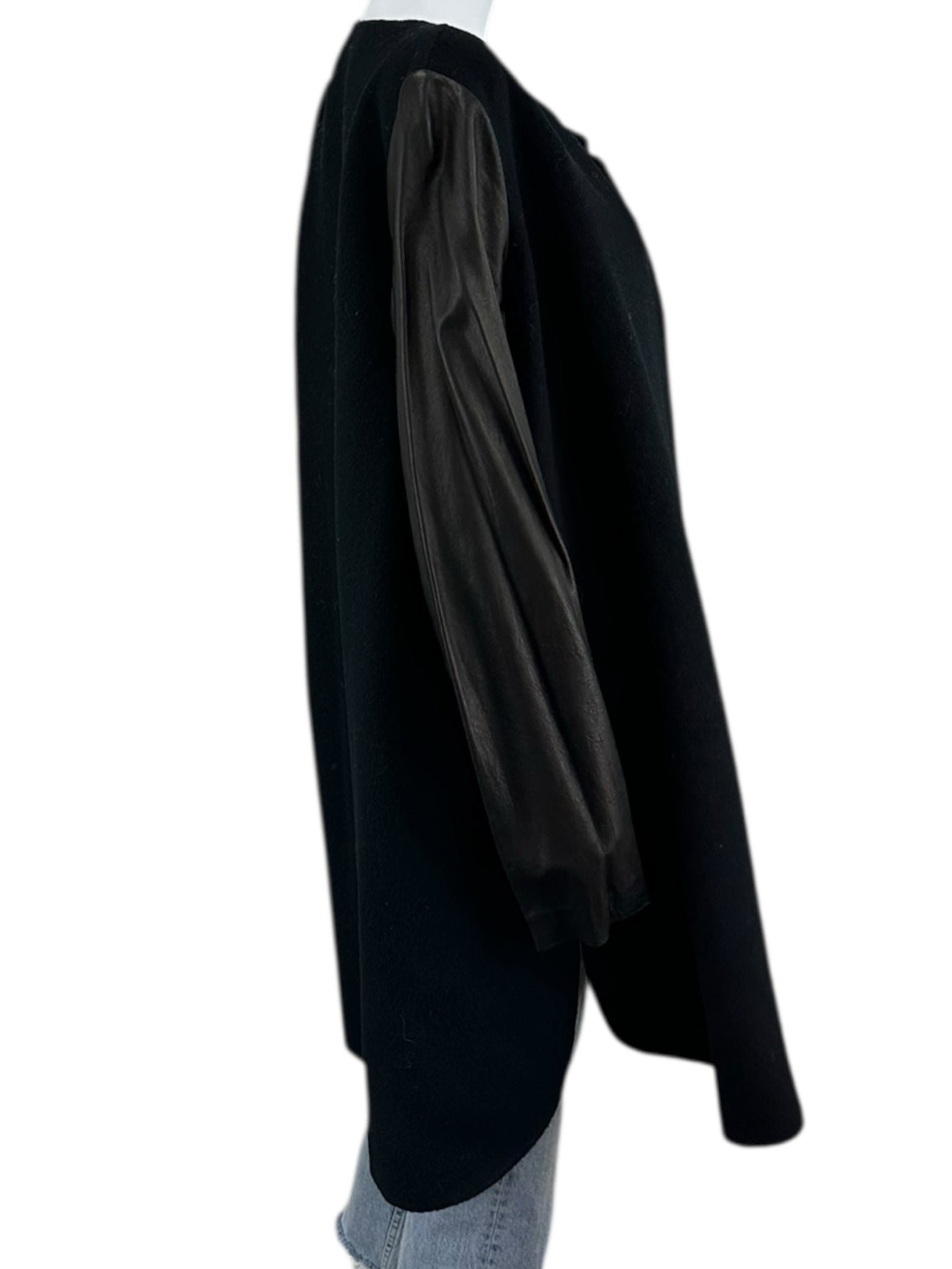 Black wool blend coat with genuine black leather sleeves, side sleeves and single snap closure at neck.