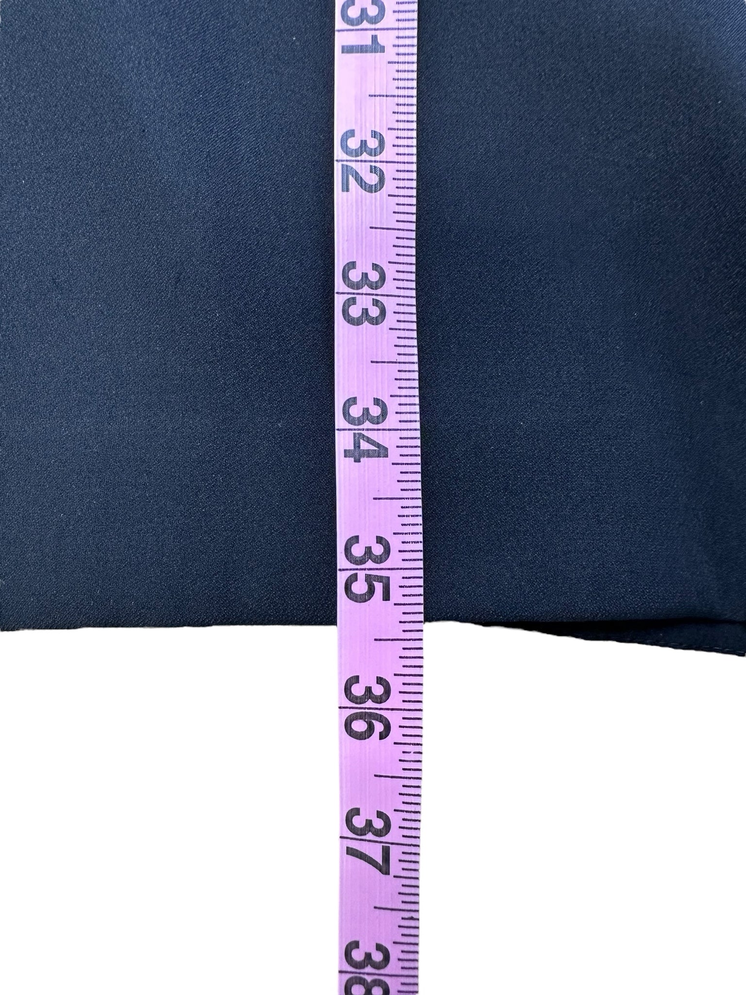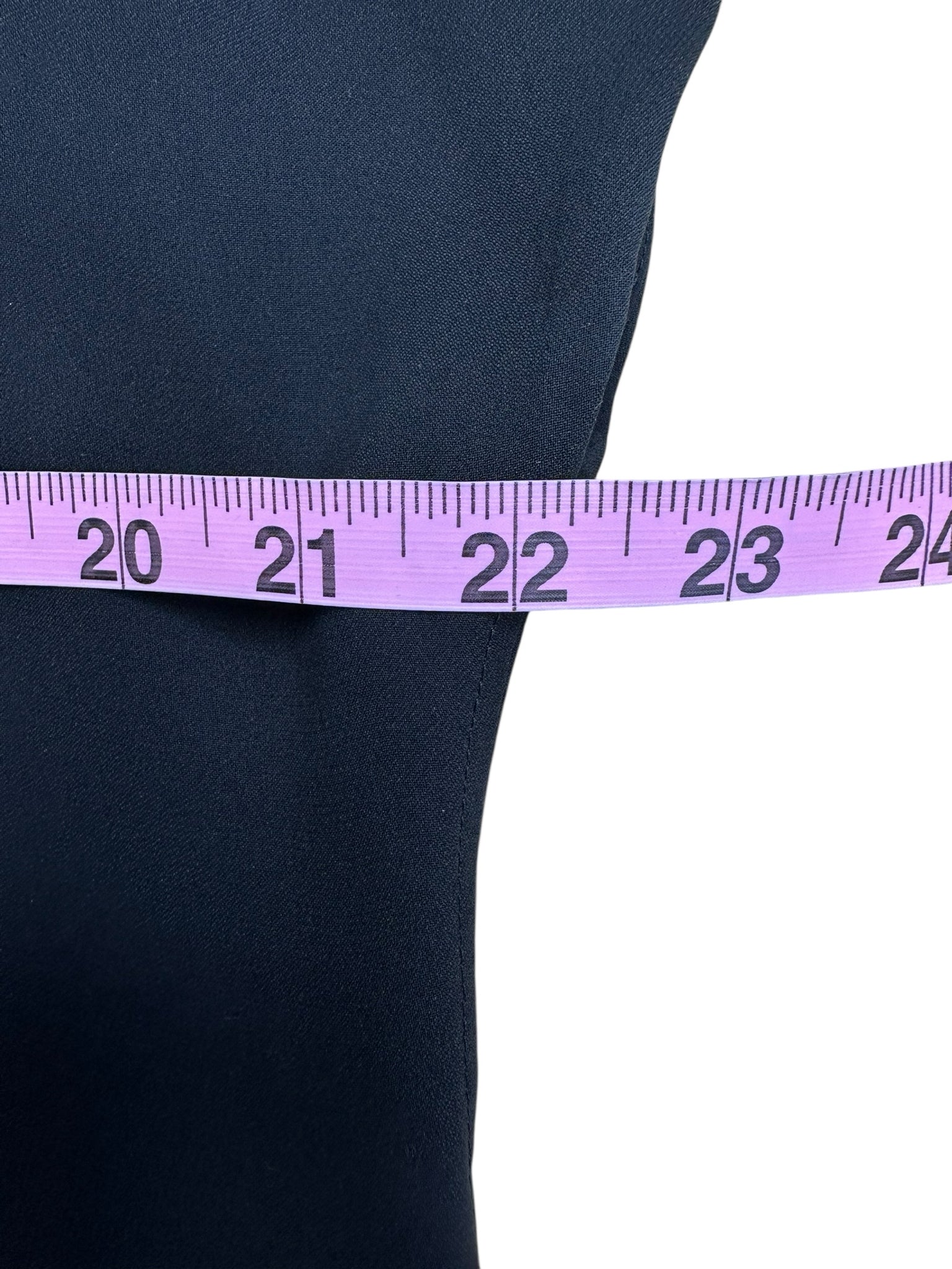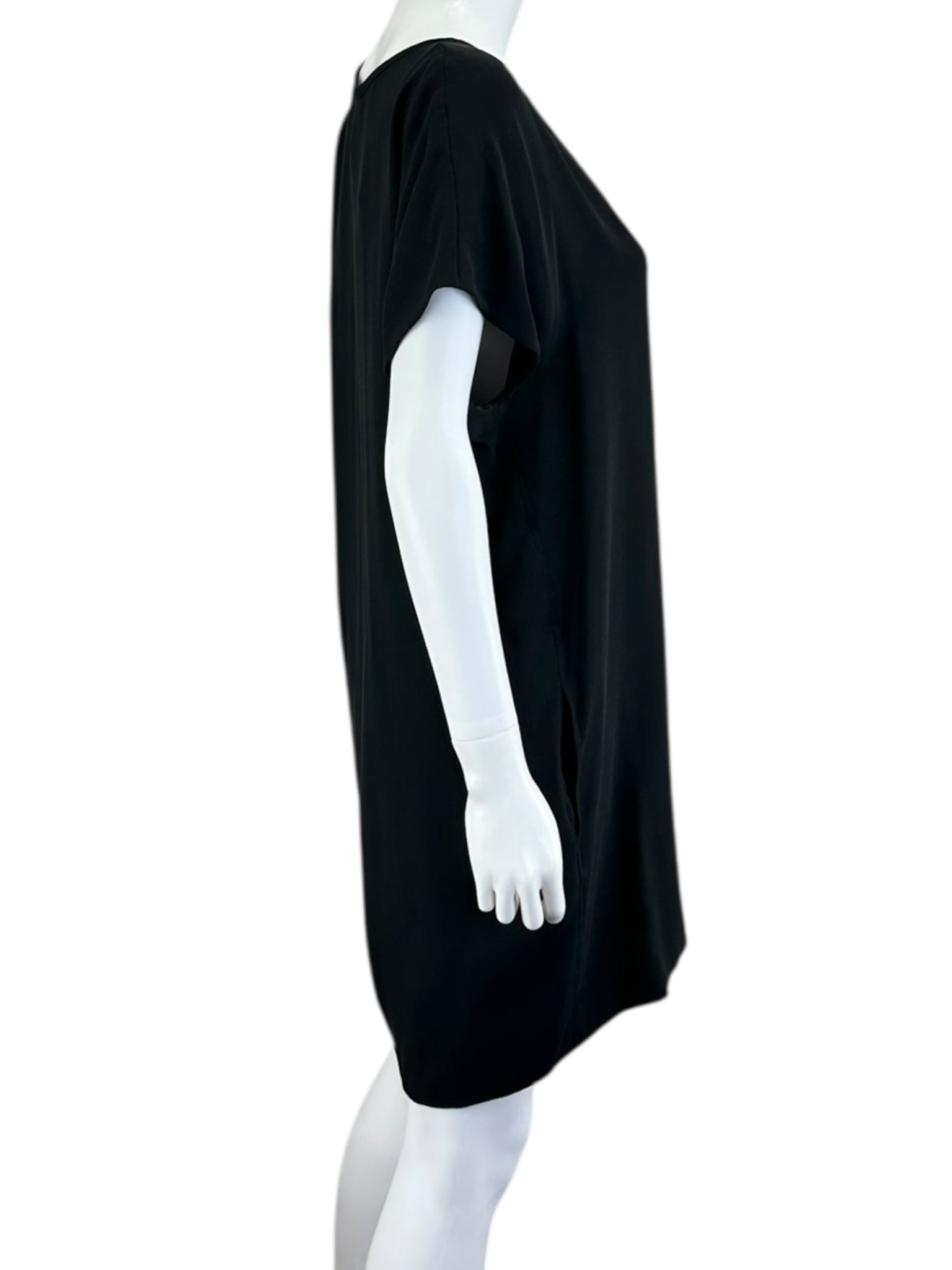Lightweight black knee length dress with split neck opening and short sleeves. Fabric content tag has been removed. Dress features side pockets and a rounded hemline.