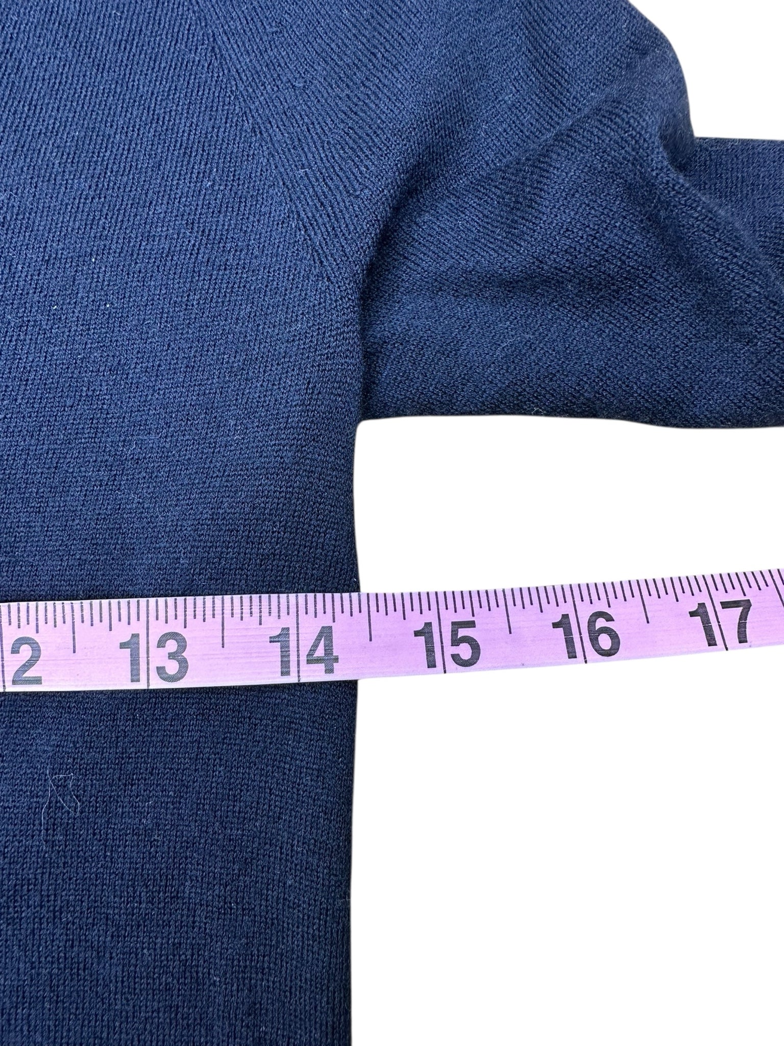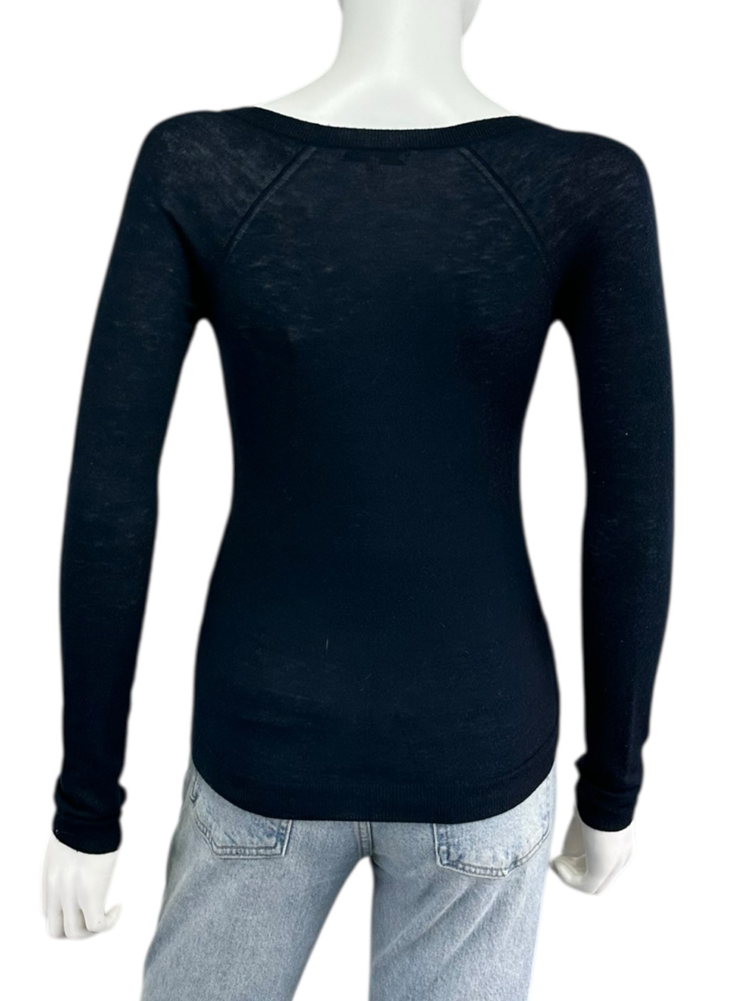 Thin dark blue sweater with a V-neck neckline and long sleeves.