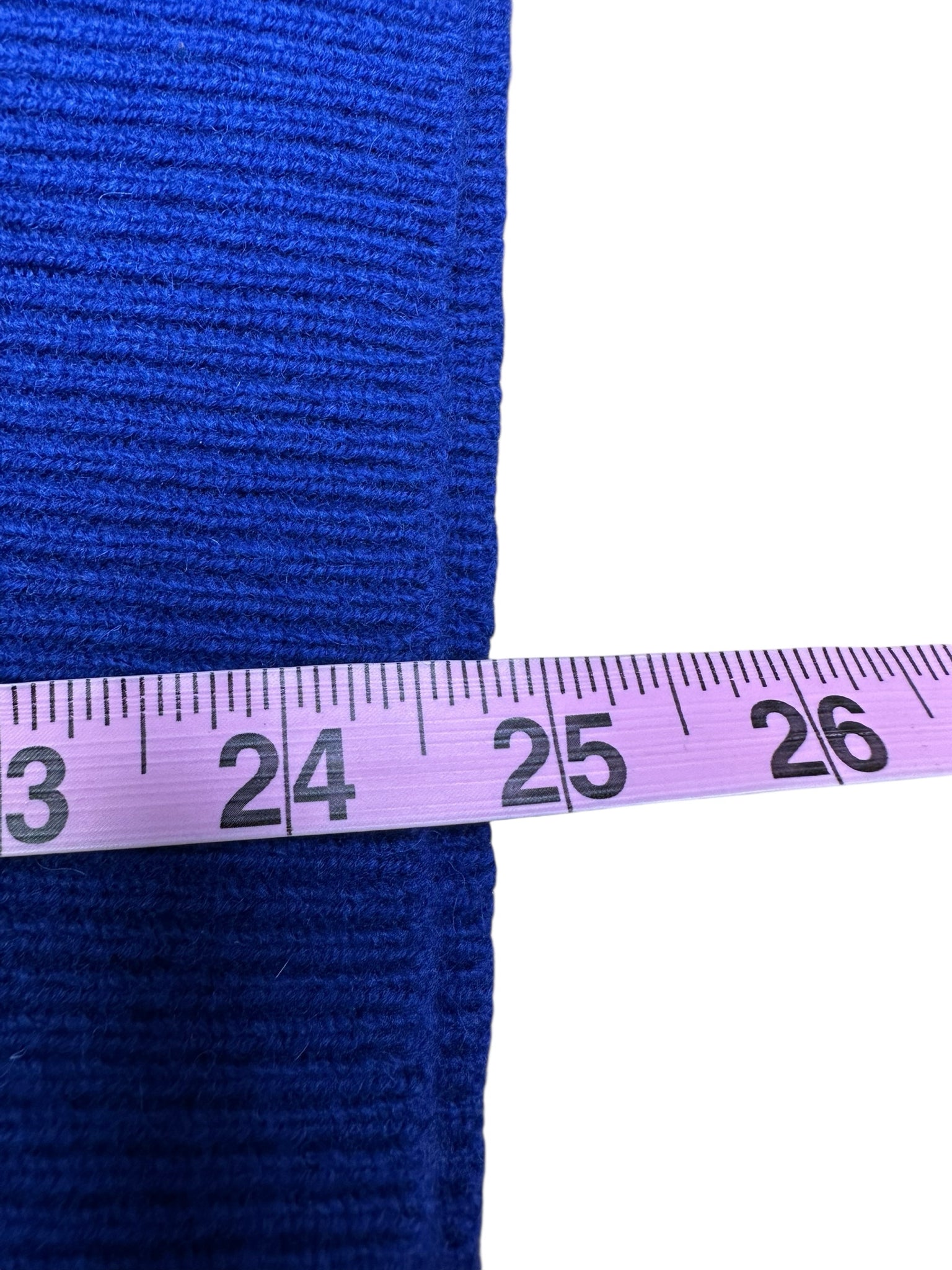 100% merino lambswool royal blue w green purple blue neckline design w side bttn pckts