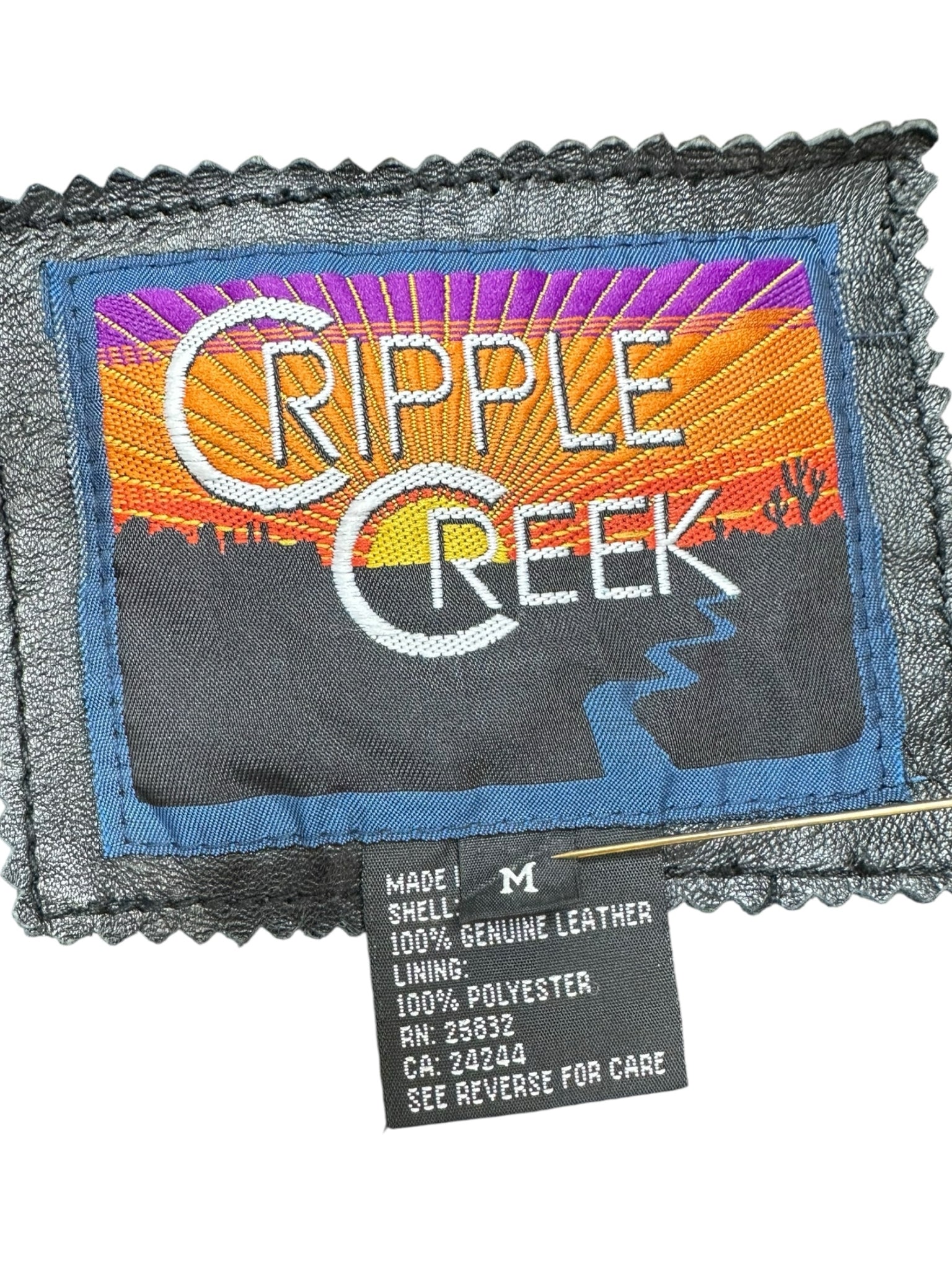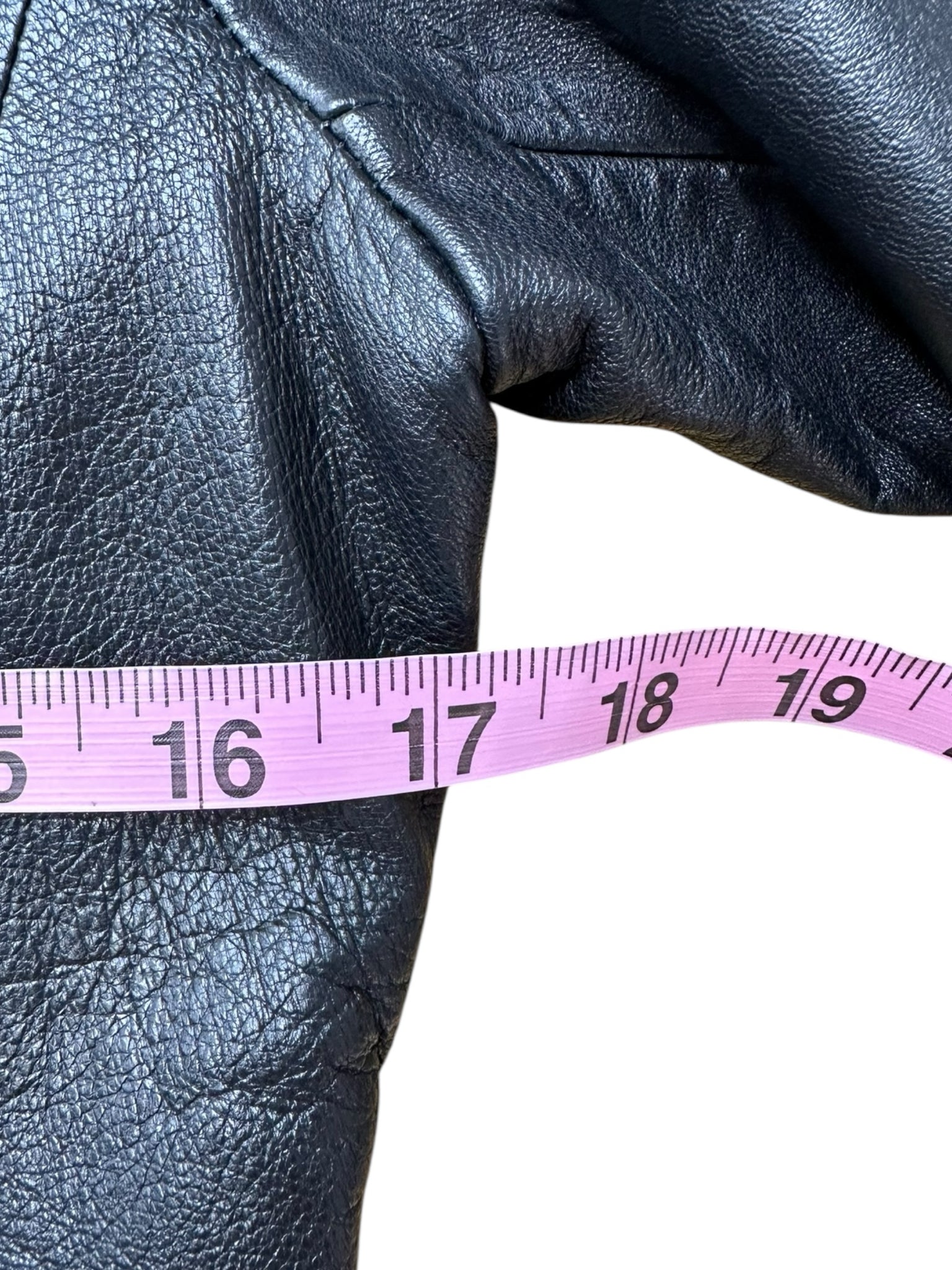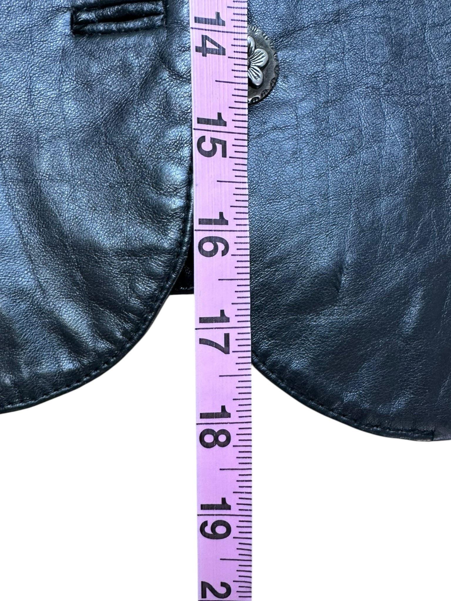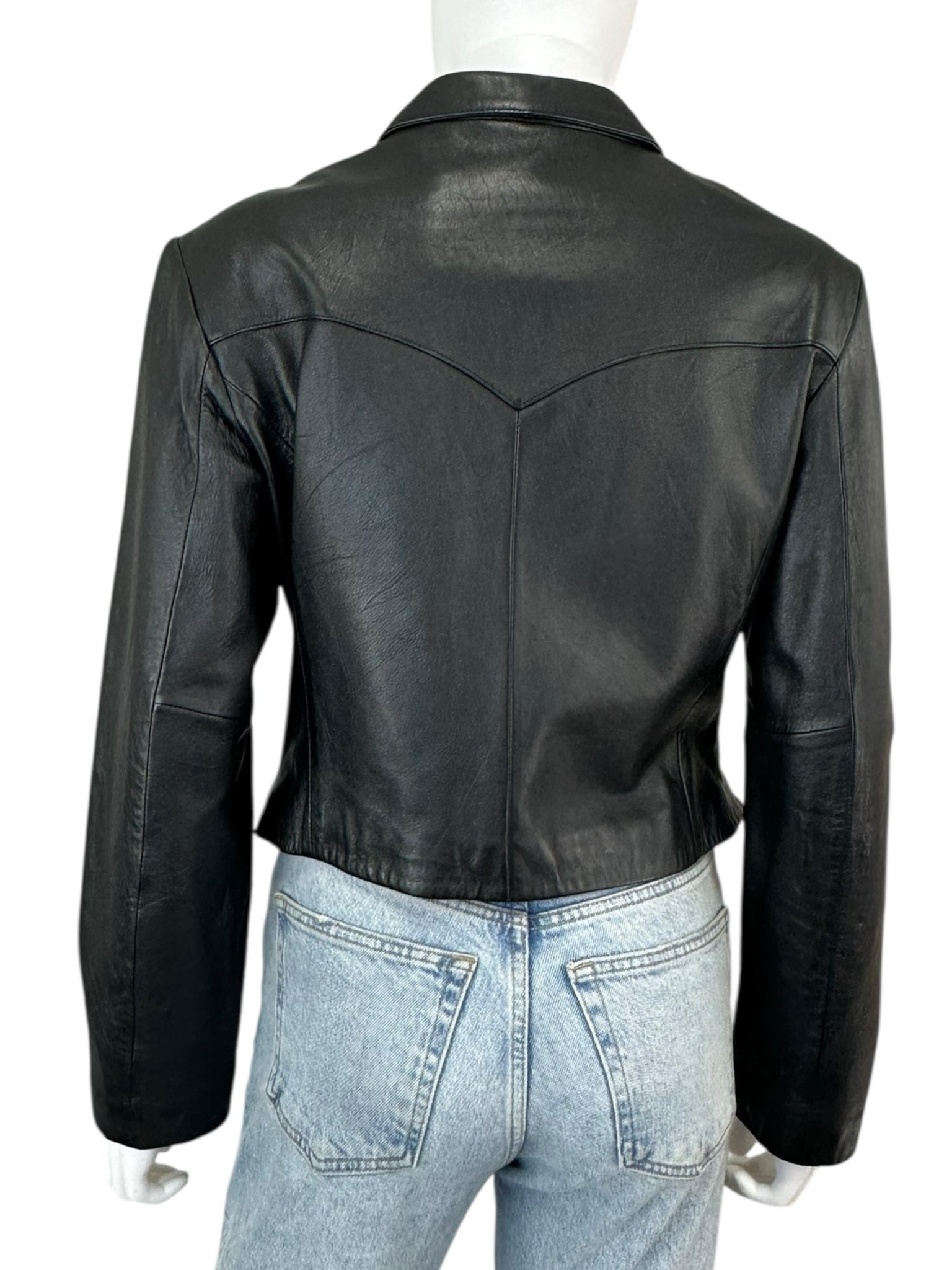 Soft and endless style black leather notched collar cropped jacket with long sleeves, front pockets and pewter decorative buttons. Jacket is lined and does show minimal signs of wear consistent with vintage condition. Pictures included to show wear at cuffs.