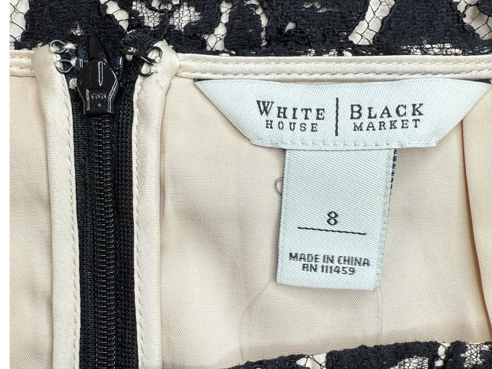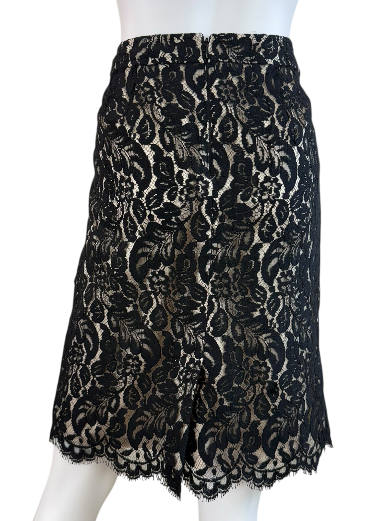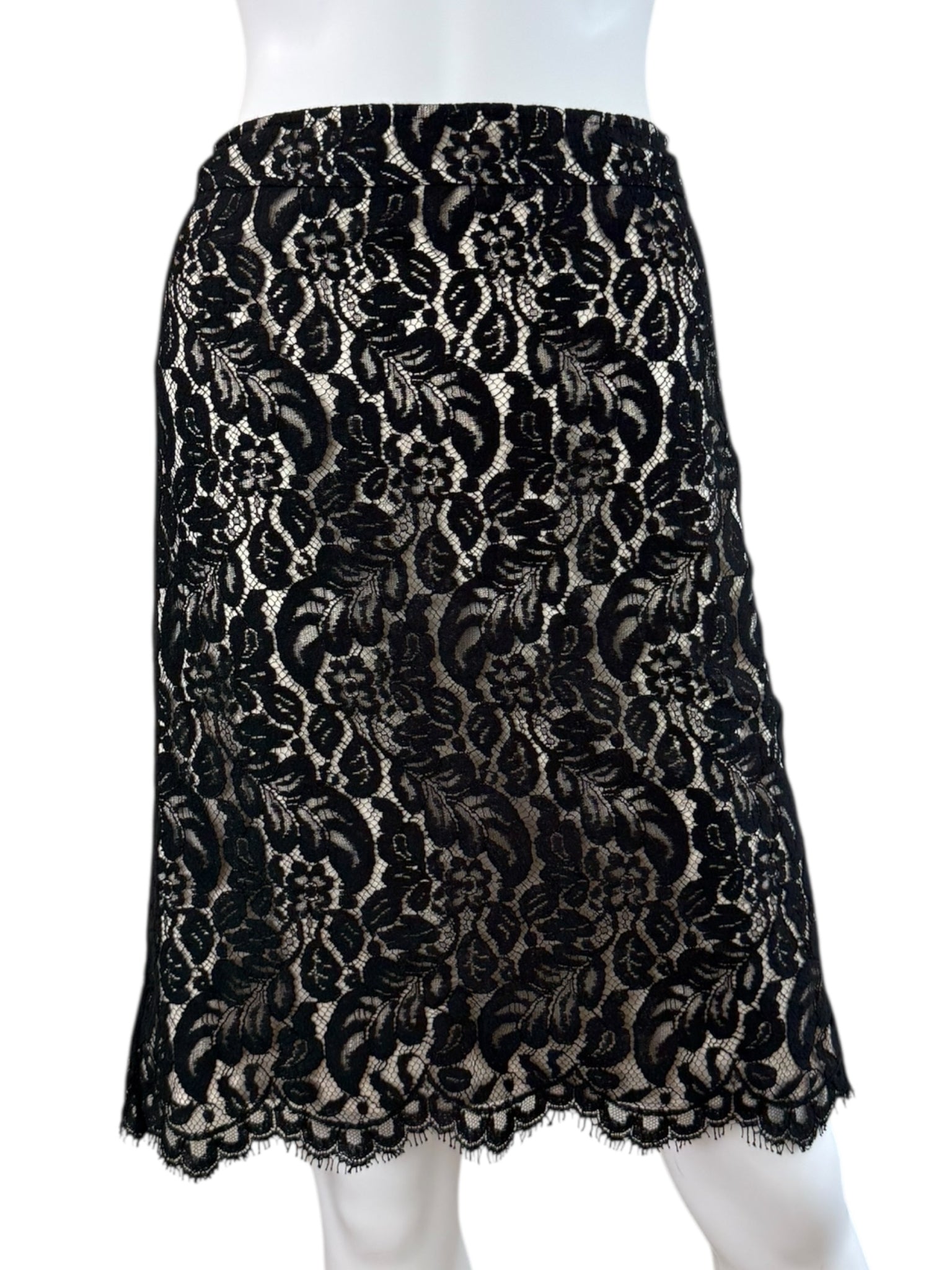 Absolutely stunning black floral lace over cream satin knee length skirt with a back zipper/hook closure.