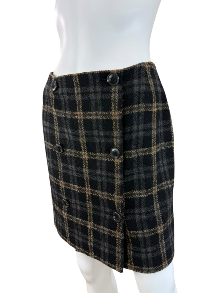 Black, brown, gray plaid wool blend mini skirt with a front button closure.