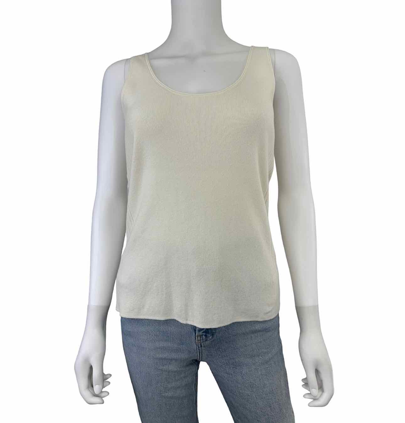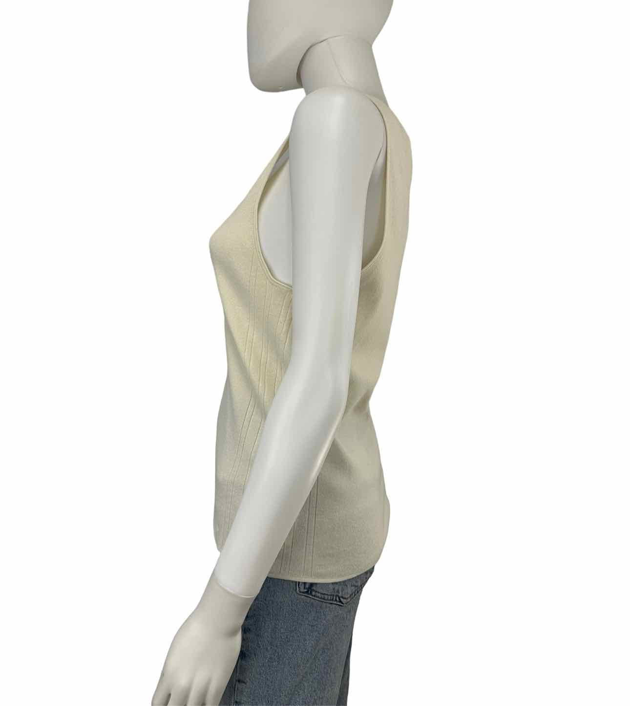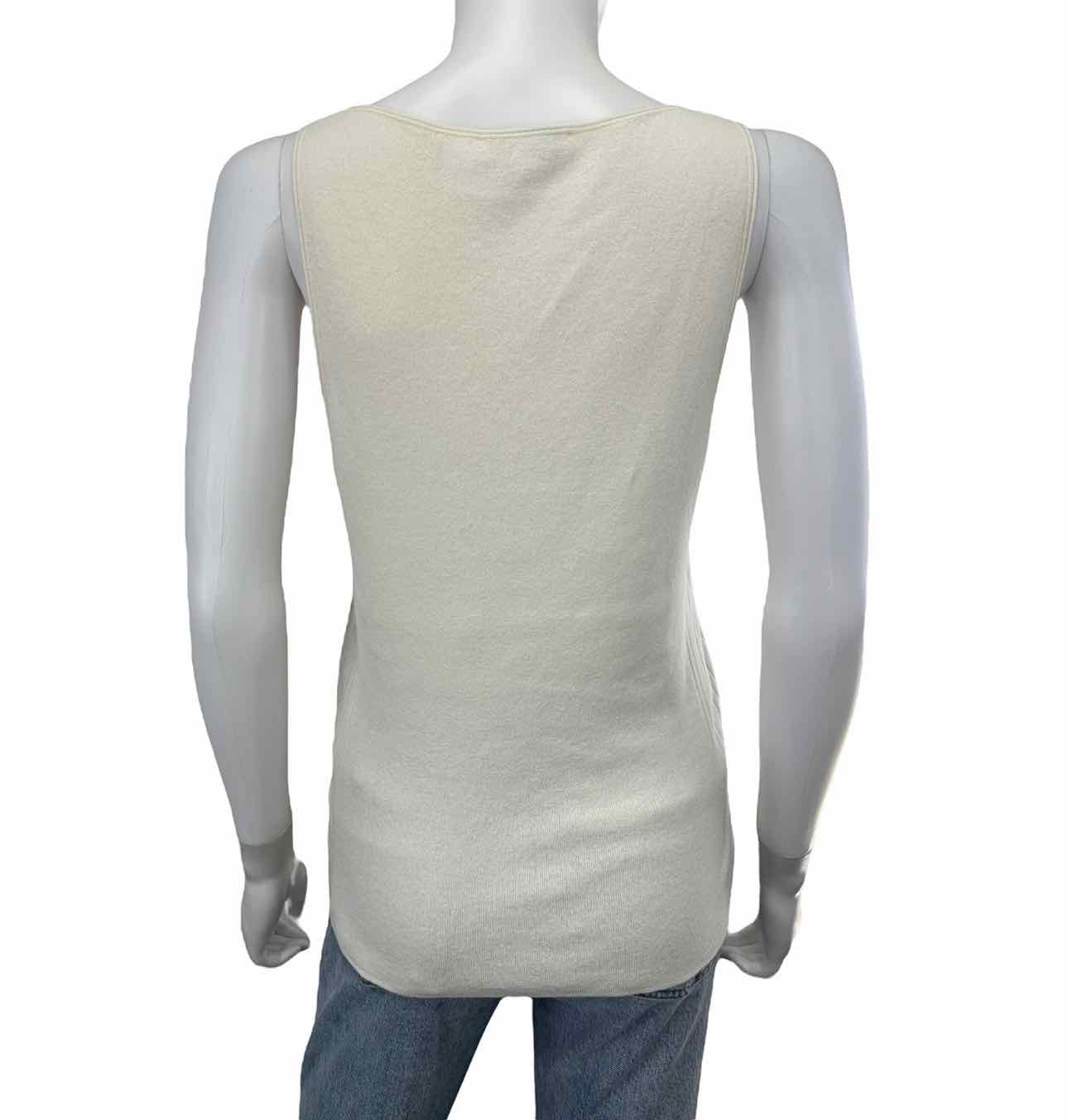 Cream cotton blend sleeveless sweater with ribbed sides and a scoop neckline.