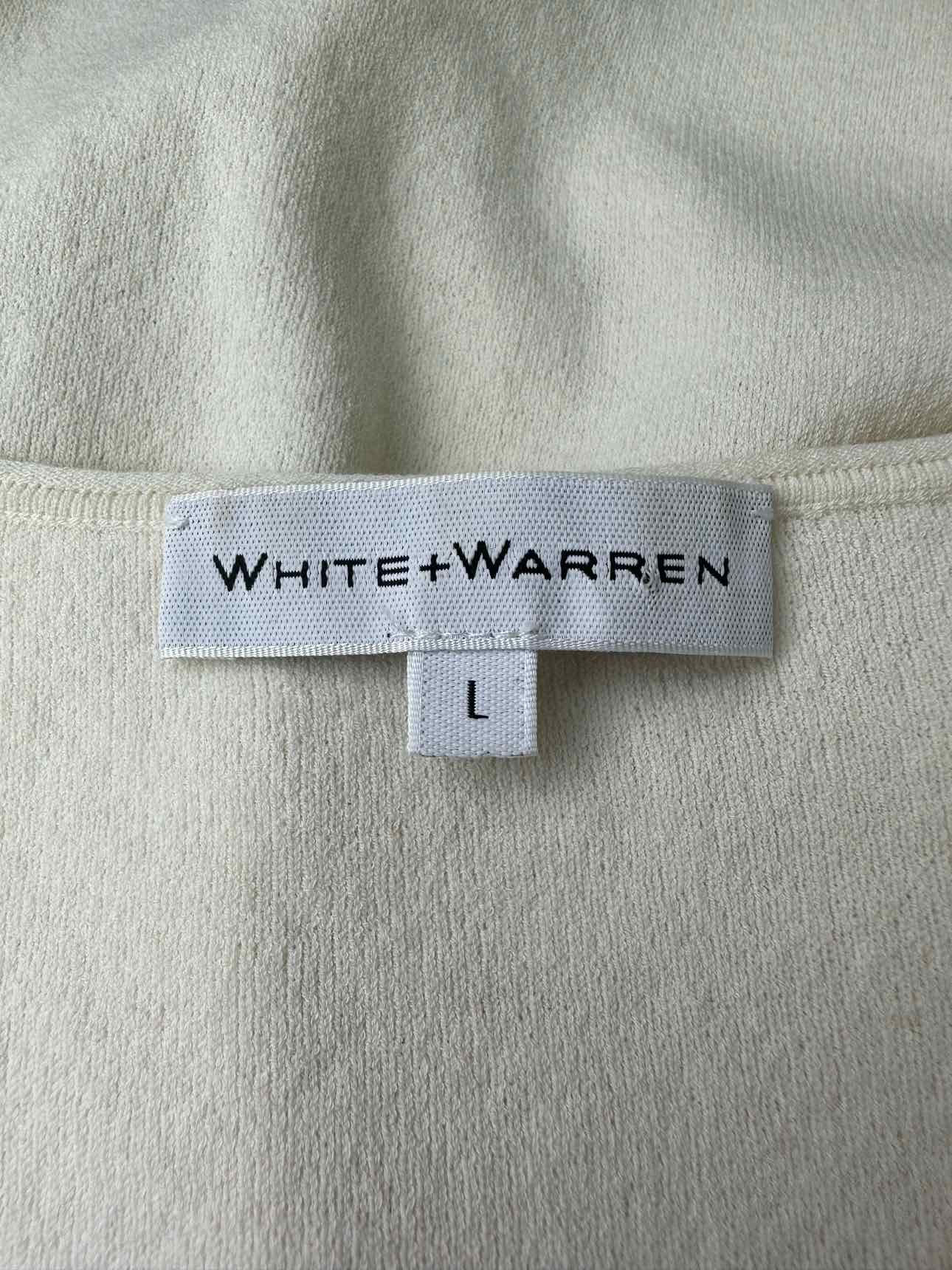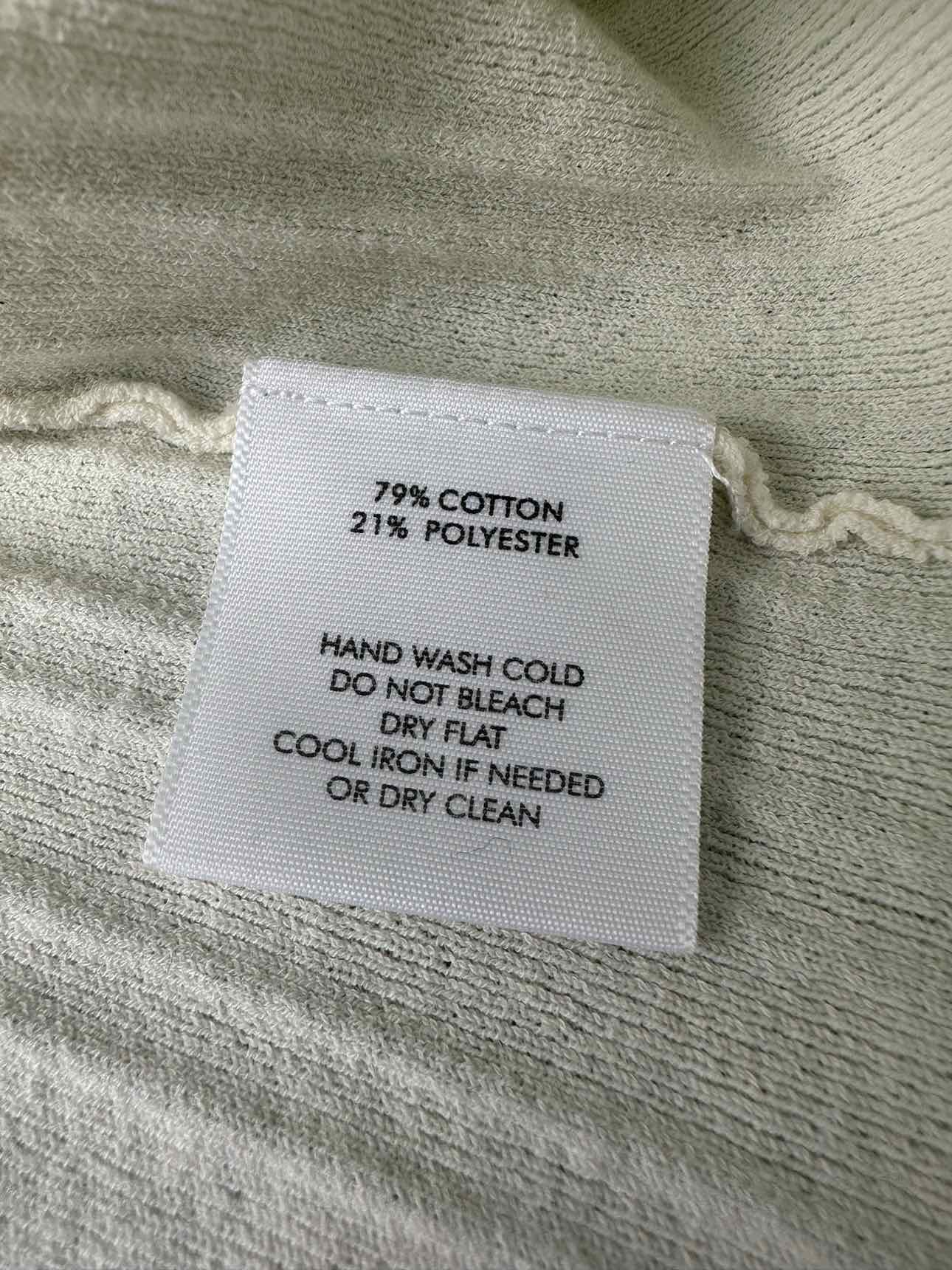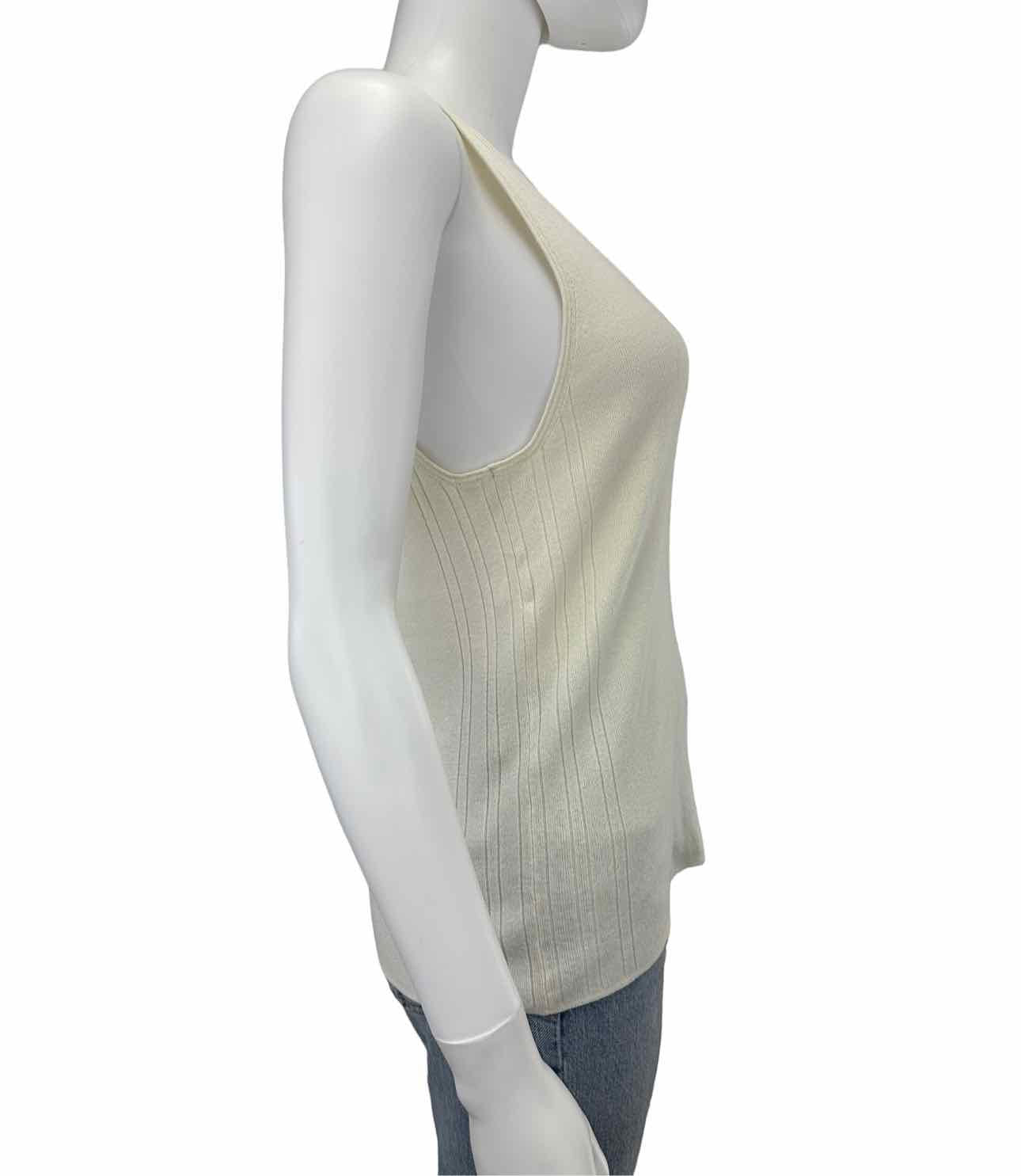 Cream cotton blend sleeveless sweater with ribbed sides and a scoop neckline.