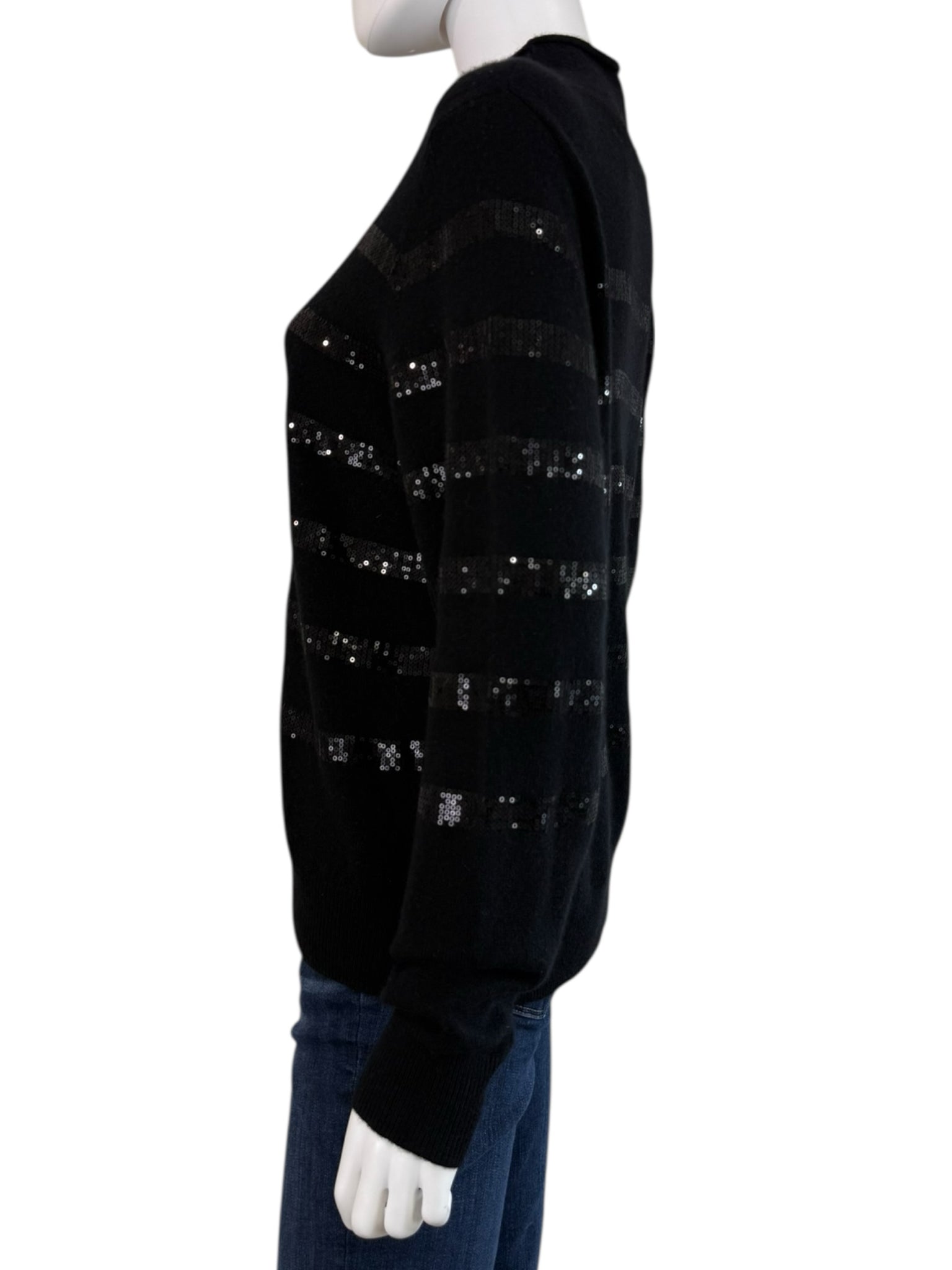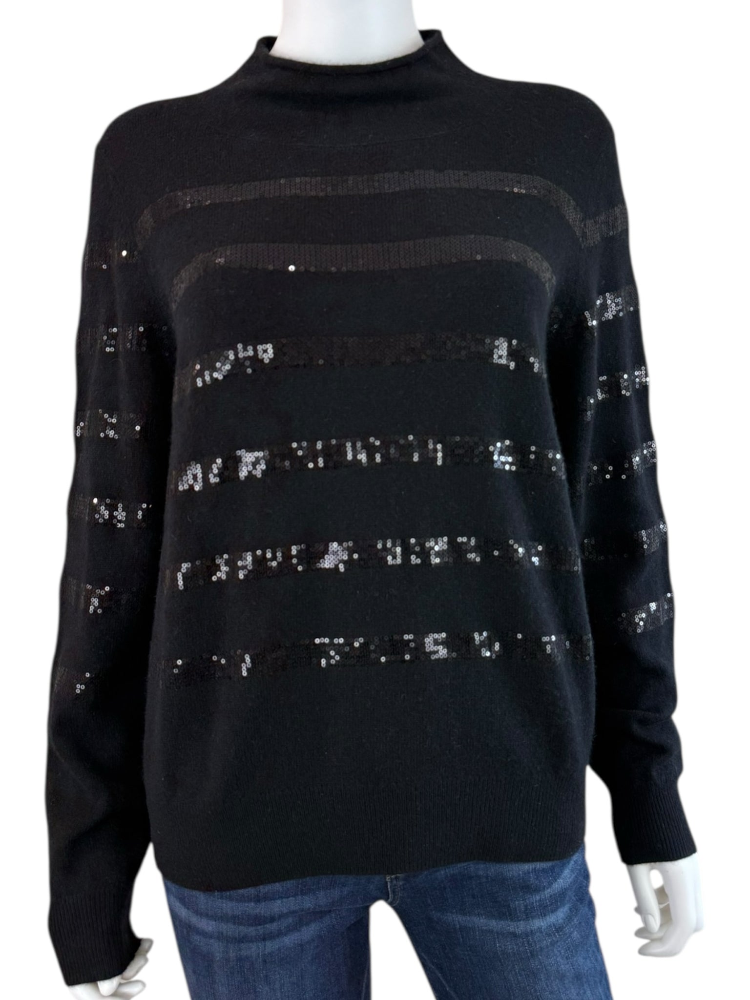 Black 100% cashmere pullover mock neck sweater with long sleeves and a sequin striped pattern.