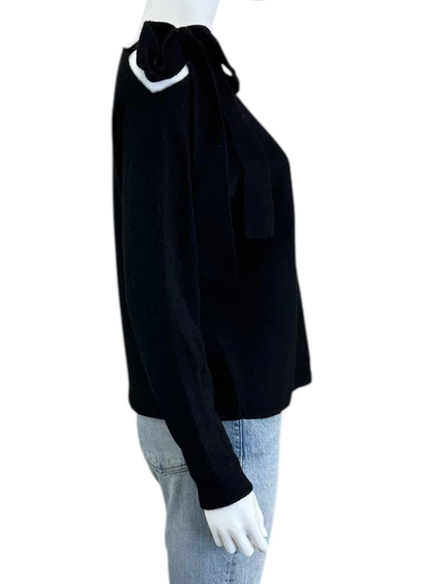Soft and comfy black cashmere sweater with long sleeves and a tie closure at shoulder.