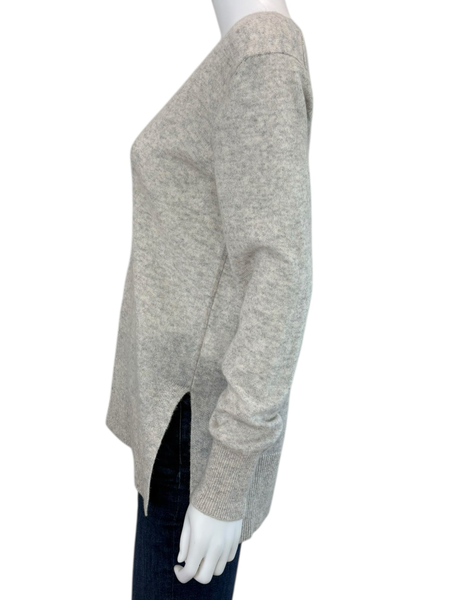 100% cashmere heather gray long sleeve pullover sweater with a v-neck neckline and slits on the side.