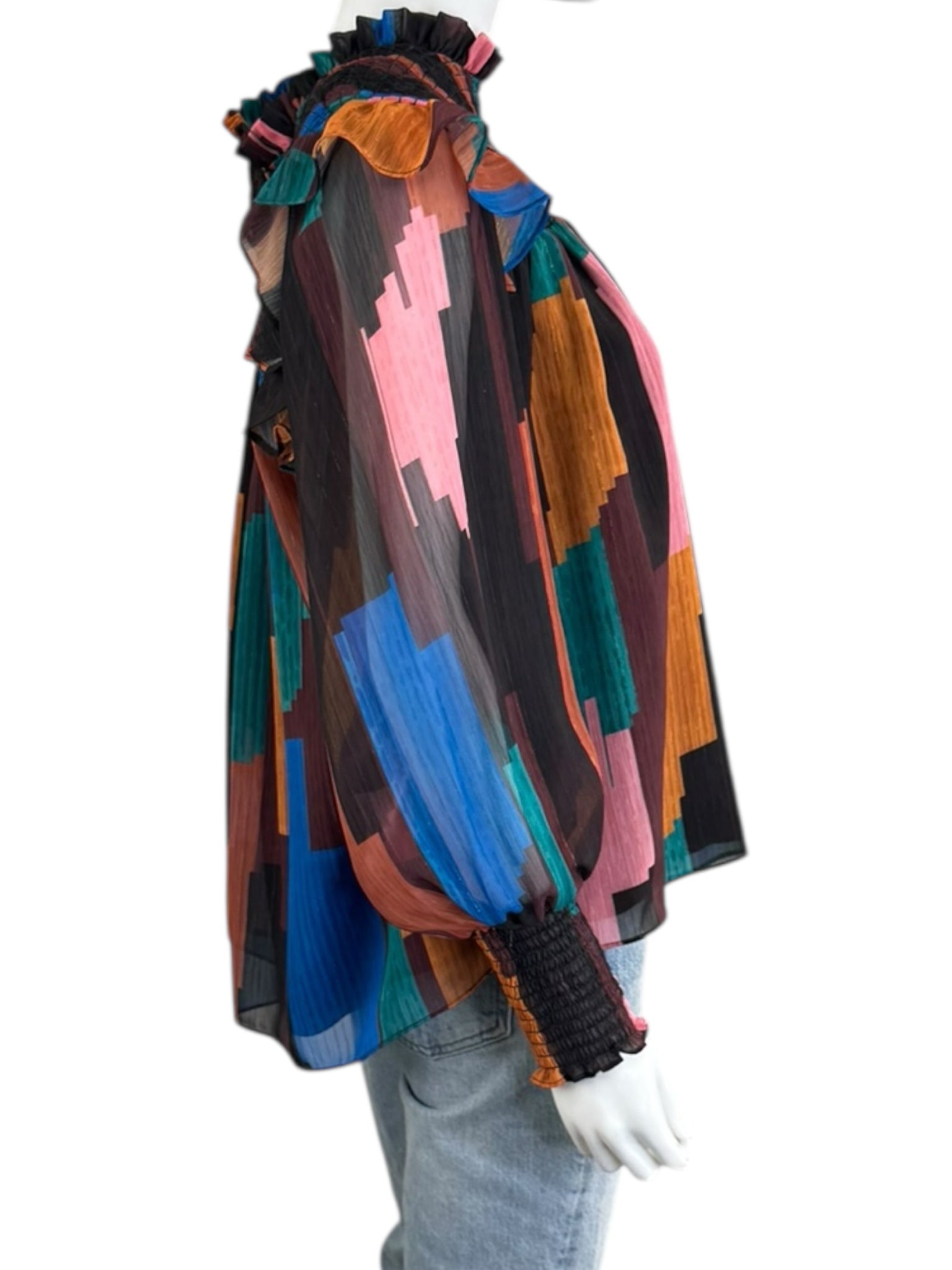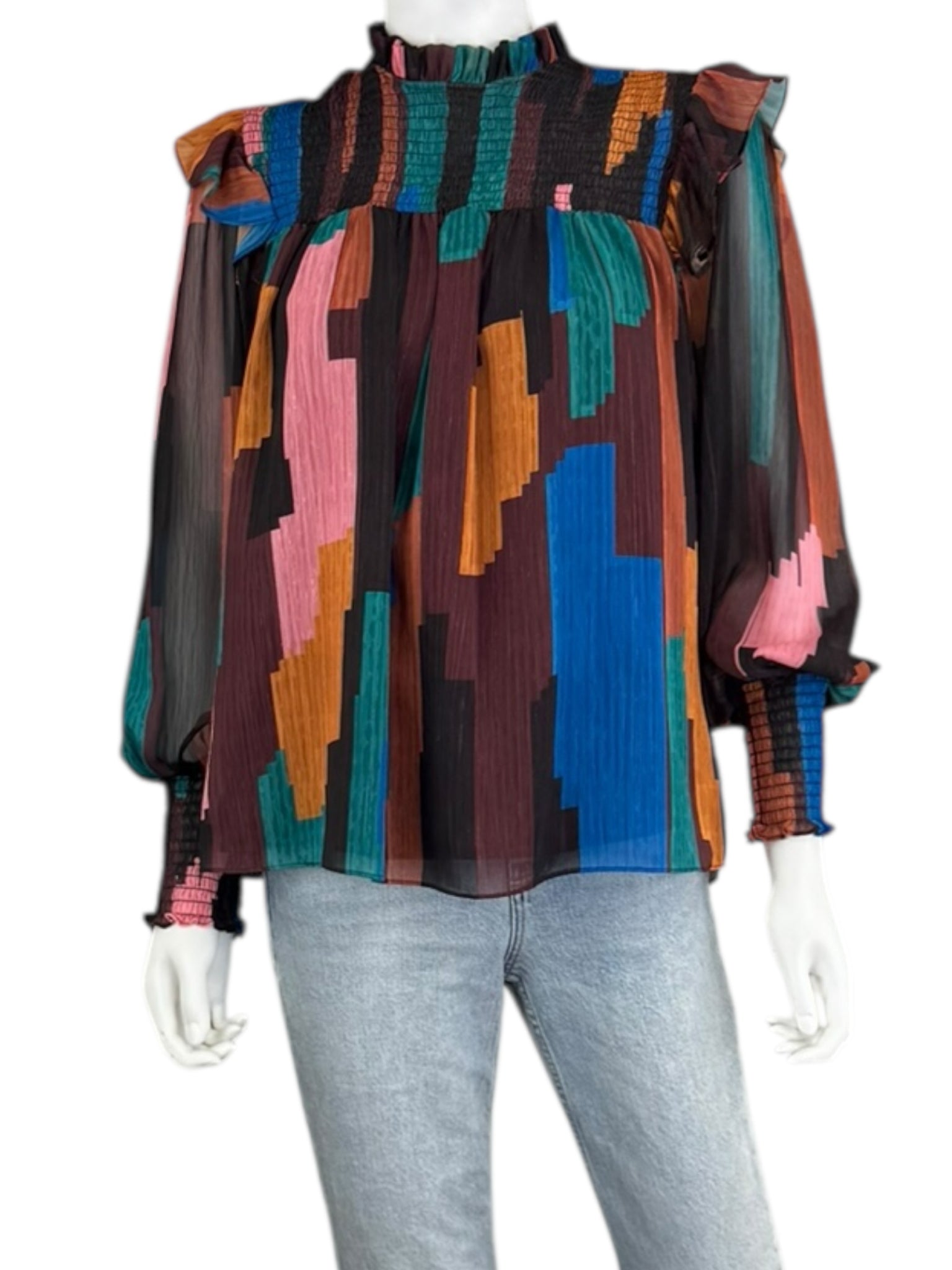Multi-colored brushstroke pattern popover top with a ruffle trim neck, smocked bodice, long sheer puff sleeves with smocked cuffs and a back keyhole opening with button closure.