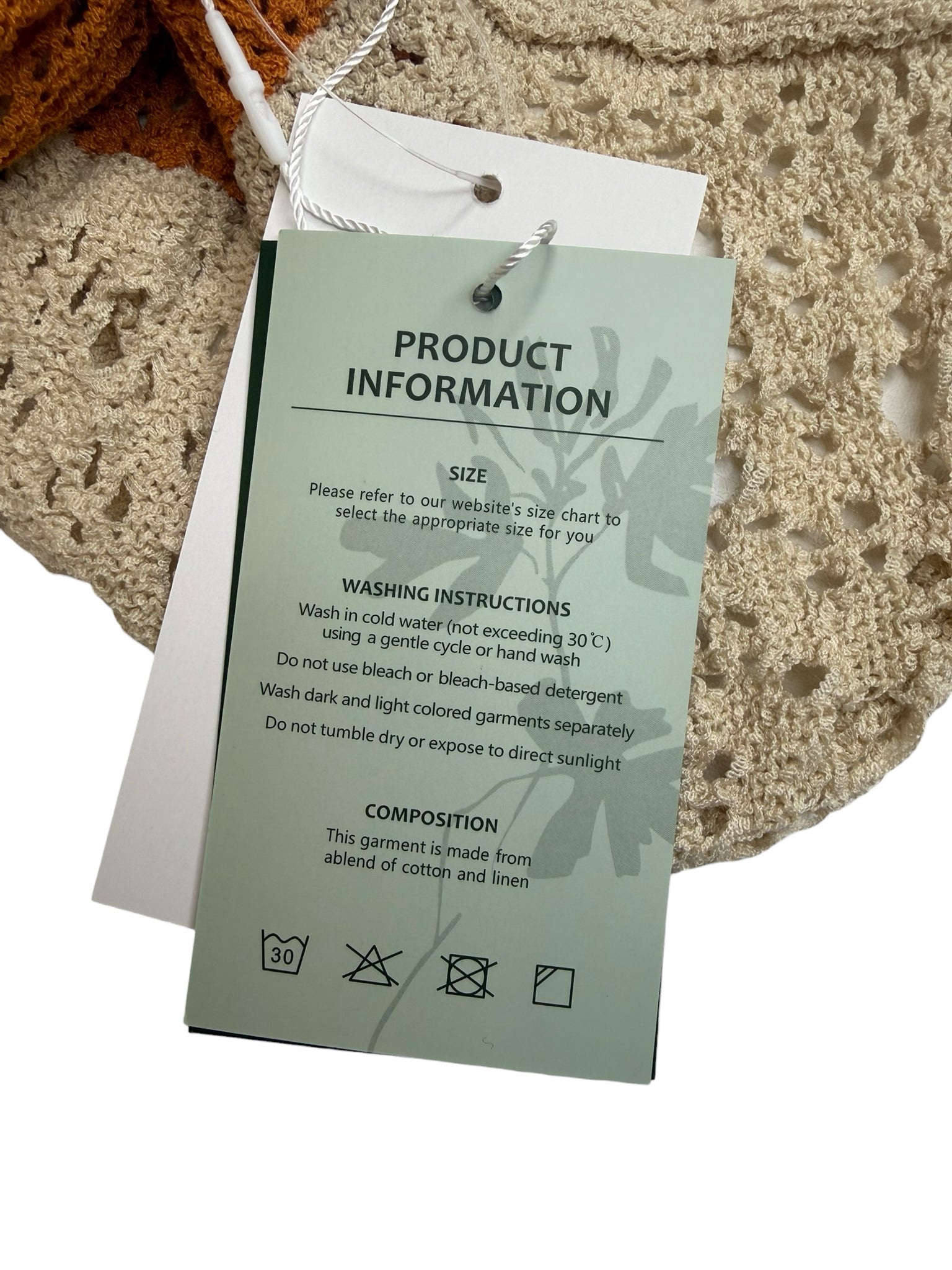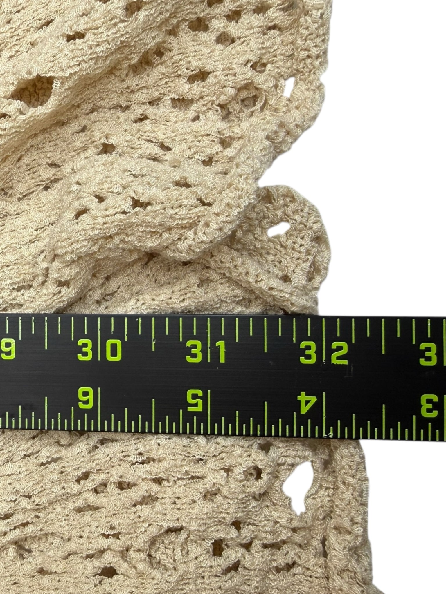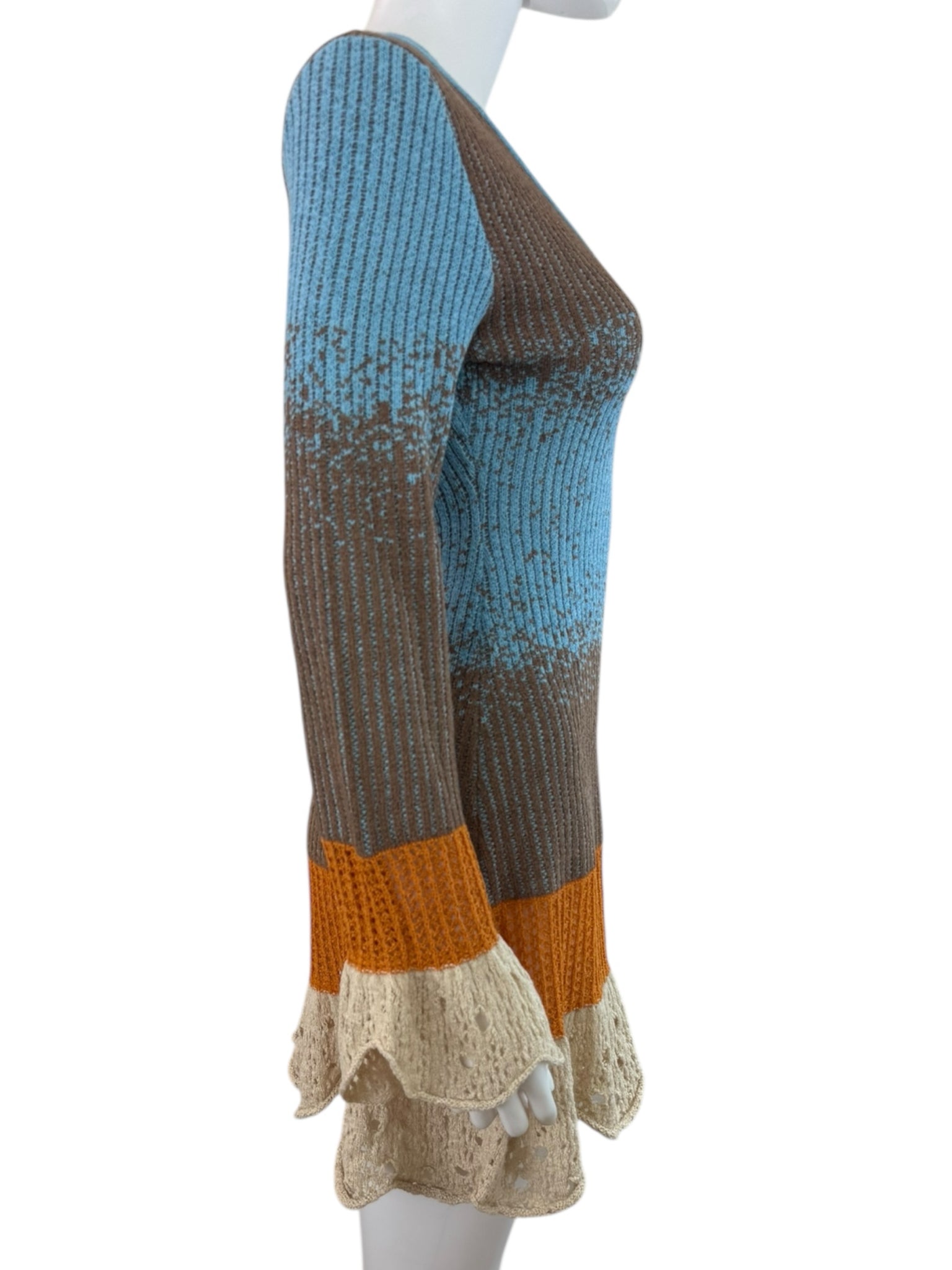New With Tags! Blue, brown, orange, and cream sweater knit dress with v neck opening and long sleeves. Dress features a crochet trim at cuffs and hemline and is made from a linen and cotton blend material.