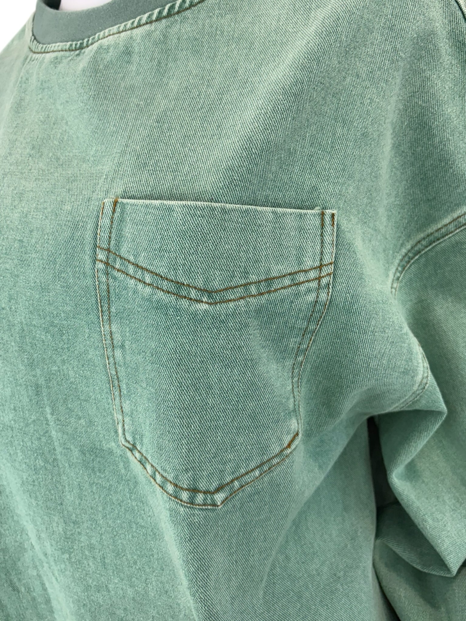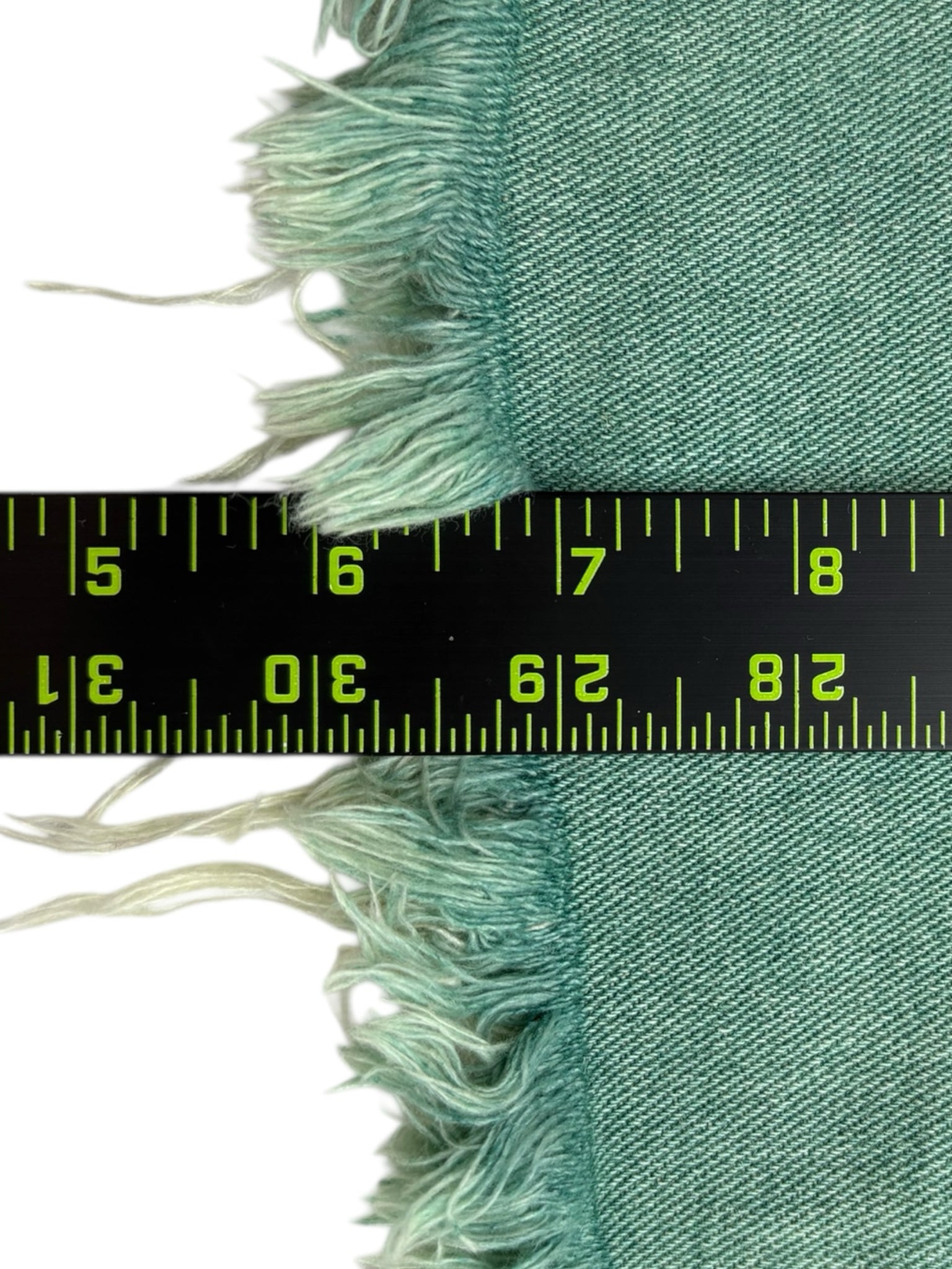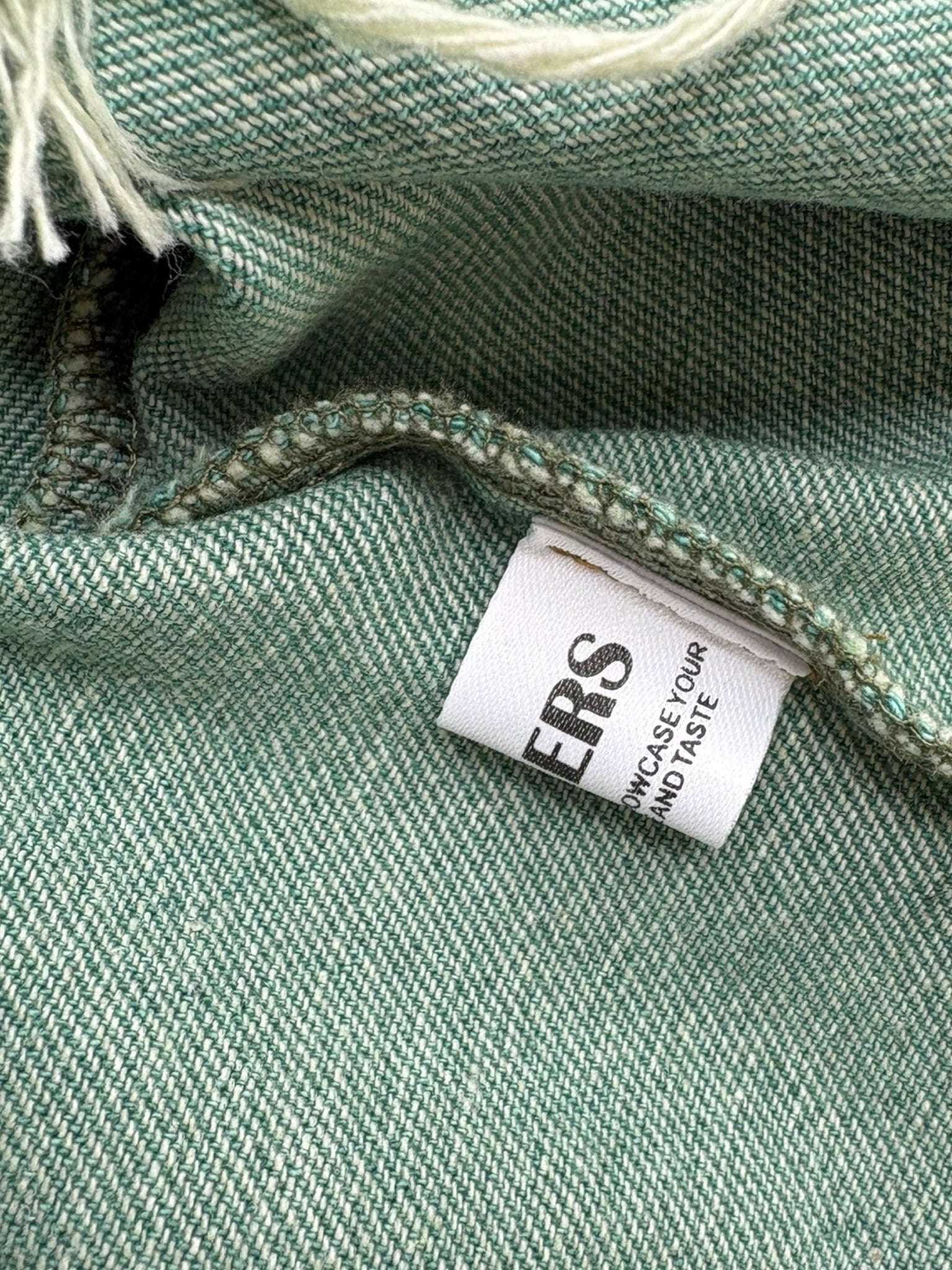 New With Tags! Green denim oversized mini dress with long sleeves, chest pockets and a raw frayed hem.
