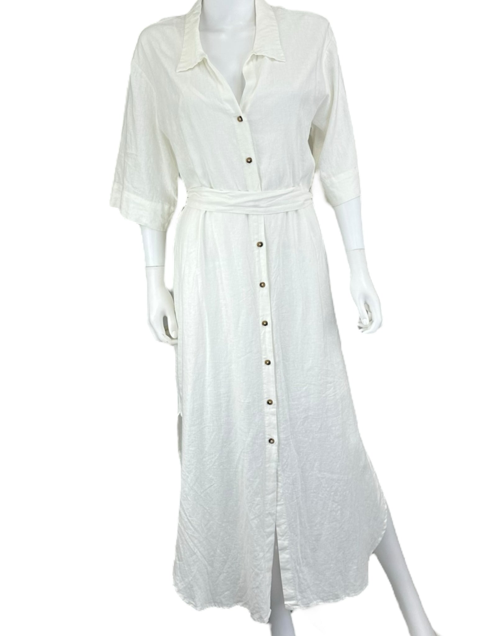 Lightweight white linen blend collared maxi dress, new with tags! Dress comes with a slip with adjustable spaghetti straps. Dress has 3/4 length sleeves, high side slits, belted waist and features a button-down closure.