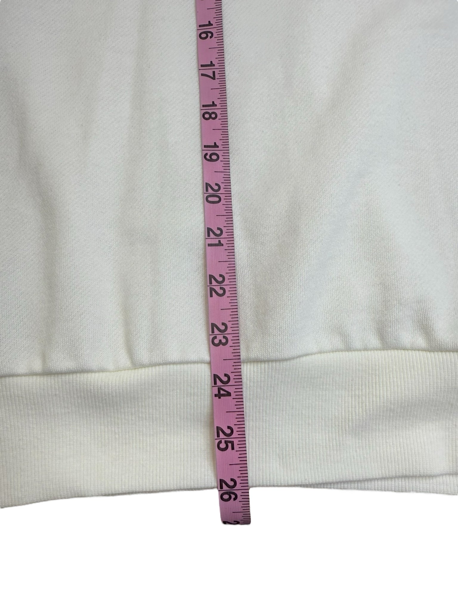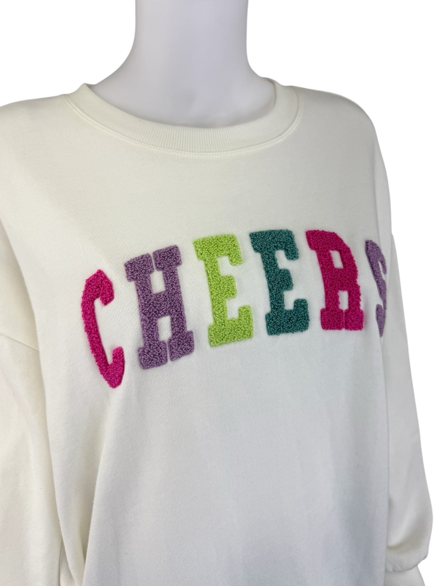 New from local boutique! Super comfy oversized white sweatshirt with long sleeves and a colorful boucle CHEERS design on front.