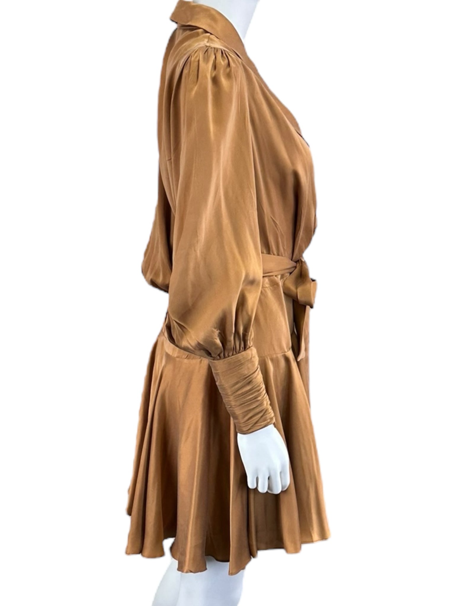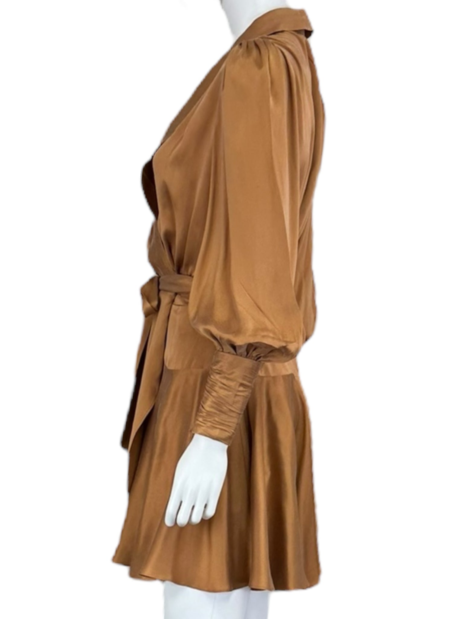100% silk wrap mini dress with long sleeves with zippered cuffs and an adjustable tie belted waist. Dress is lightweight and super soft.